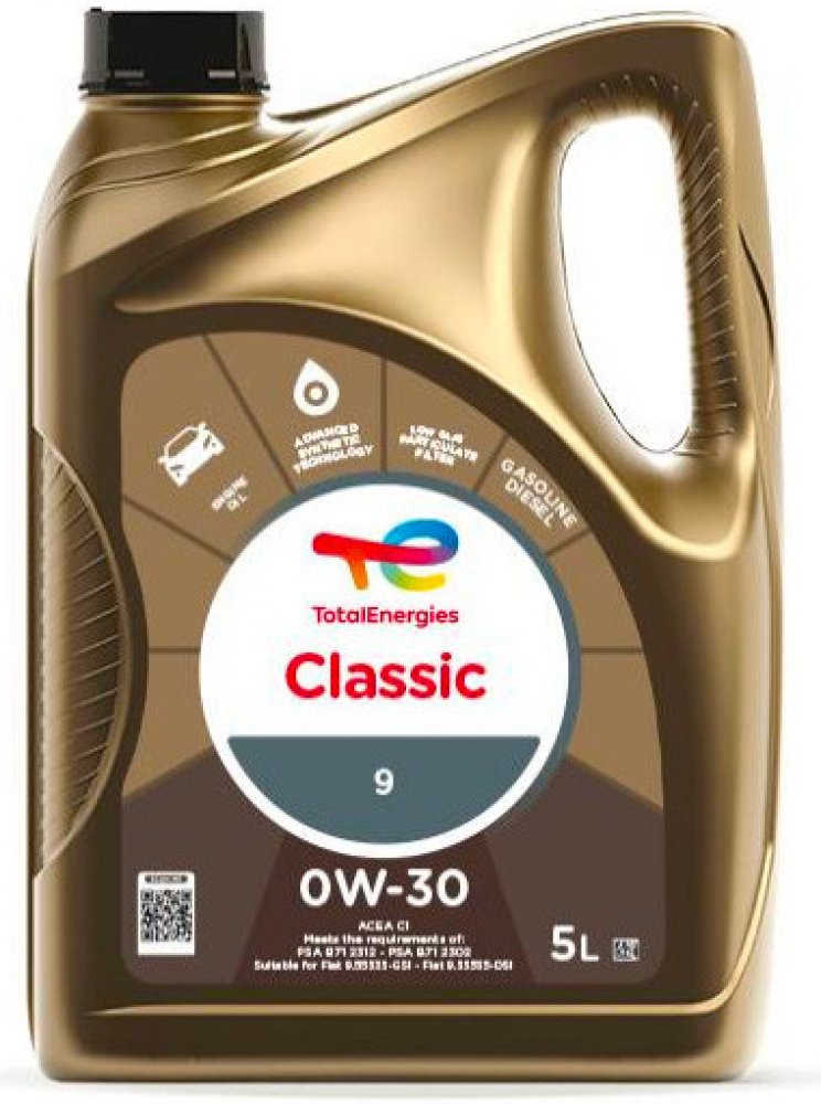 Total Classic 9 0W-30 je syntetický motorový olej, navržený pro poskytování maximálního výkonu a ochrany moderních benzinových a dieselových motorů. Tento olej vyniká svým unikátním složením, které zajišťuje optimální ochranu motoru, dlouhou životnost filtrů FAP a SCR a vynikající hospodárnost provozu.