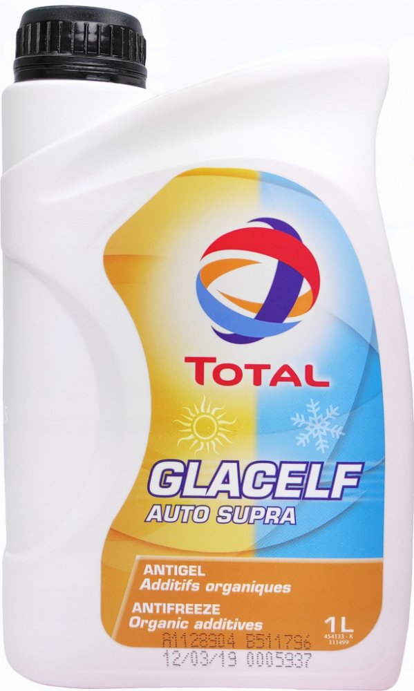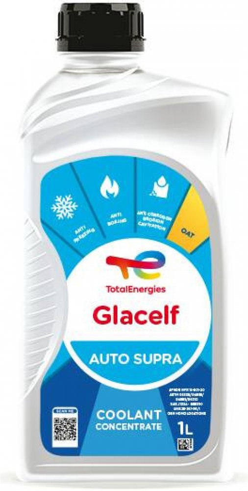 TOTAL Glacelf Auto Supra je nemrznoucí chladící koncentrát na bázi monoetylenglykolu a organických inhibitorů určený zejména pro chladící okruhy spalovacích motorů vozidel. Neobsahuje aminy, nitráty, fosfáty. Vytváří se smícháním s vodou nemrznoucí chladící kapalinu dlouhé životnosti s účinnou antikorozivní ochranou vyvinutou moderní patentovanou technologií. TOTAL Glacelf Auto Supra se používá naředěný demineralizovanou vodou, s níž vytváří stabilní kapalinu, jež chrání celoročně chladící systém proti zamrznutí a přehřátí. Za účelem vytvoření správné směsi je nutno zajistit dokonalé promíchání s vodou. Maximální ochrana je při koncentraci 68% Total Glacelf Auto Supra, nepoužívat vyšší koncentraci než 70% . Je zejména doporučen pro litinové a hliníkové motory a pro chladící systémy obsahující chladiče z hliníkových nebo měděných slitin. Speciálně doporučen pro motory moderních konstrukcí k ochraně hliníku při vysokých teplotách. Použití: V roztoku s demineralizovanou nebo změkčenou vodou. Minimální koncentrace 33%. Maximální koncentrace 70%. Účinná dlouhodobá ochrana hliníkových a měděných slitin Výkonové třídy, specifikace: AFNOR NFR 15-601 ASTM D 3306 ASTM D 4656 ASTM D4985 BS 6580 GM 6277M DEUTZ/MWM Leyland Trucks MMAN 324 Vhodný pro: LEYLAND TRUCKS JAGUAR OPEL-GM 6277 M RENAULT TRUCKS Balení: 1L 20L 60L 208L Technický list