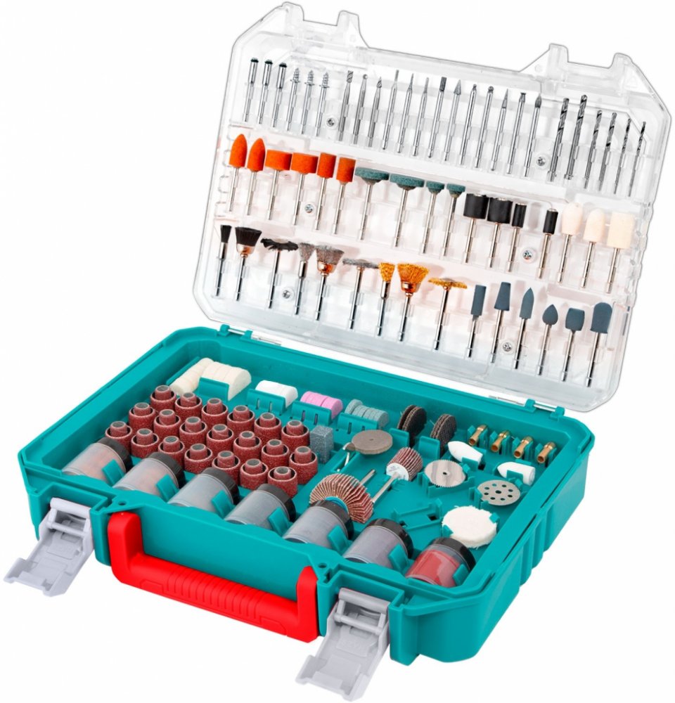 Velké příslušenství k přímé brusce. Obsahuje: 40ks Pískový kroužek, 7 ks sukně, 2ks Kulová plsť, 1 ks látkové kolečko, 4ks Gumový leštící kotouč, 6ks spirálový vrták, 3ks fréza, 1ks Diamantový pilový kotouč, 1ks Pilový kotouč z nerezové oceli, 3ks Pevná tyč pro brusný kotouč10ks King Kong brusná jehla, 10ks Diamantová brusná hlava, 9ks Brusná hlava9 ks štětce, 4 ks sklíčidla, 6ks Řezný kotouč, 1ks Gumový brusný kotouč, 18ks Brusný kotouč bez tyče, 1ks Brusný kámen, 2ks S oběžným kolem tyče set,1ks klíč, 120ks Kus brusného kotouče, 157ks Brusný papír, 1 ks pasty, 3ks Nestandardní závitový bit. Baleno v plastové krabičce