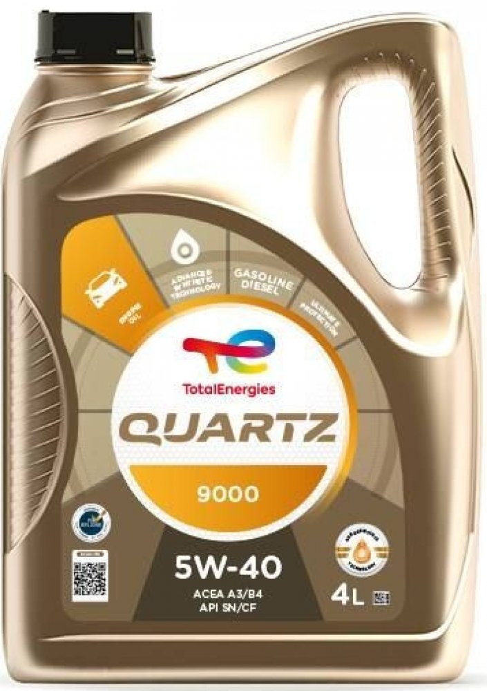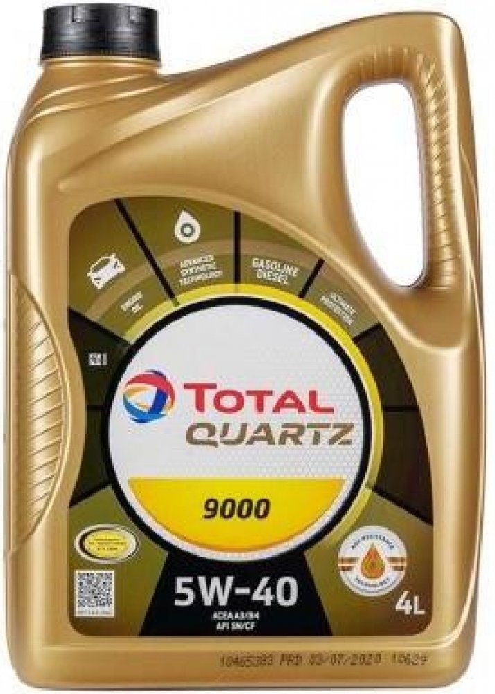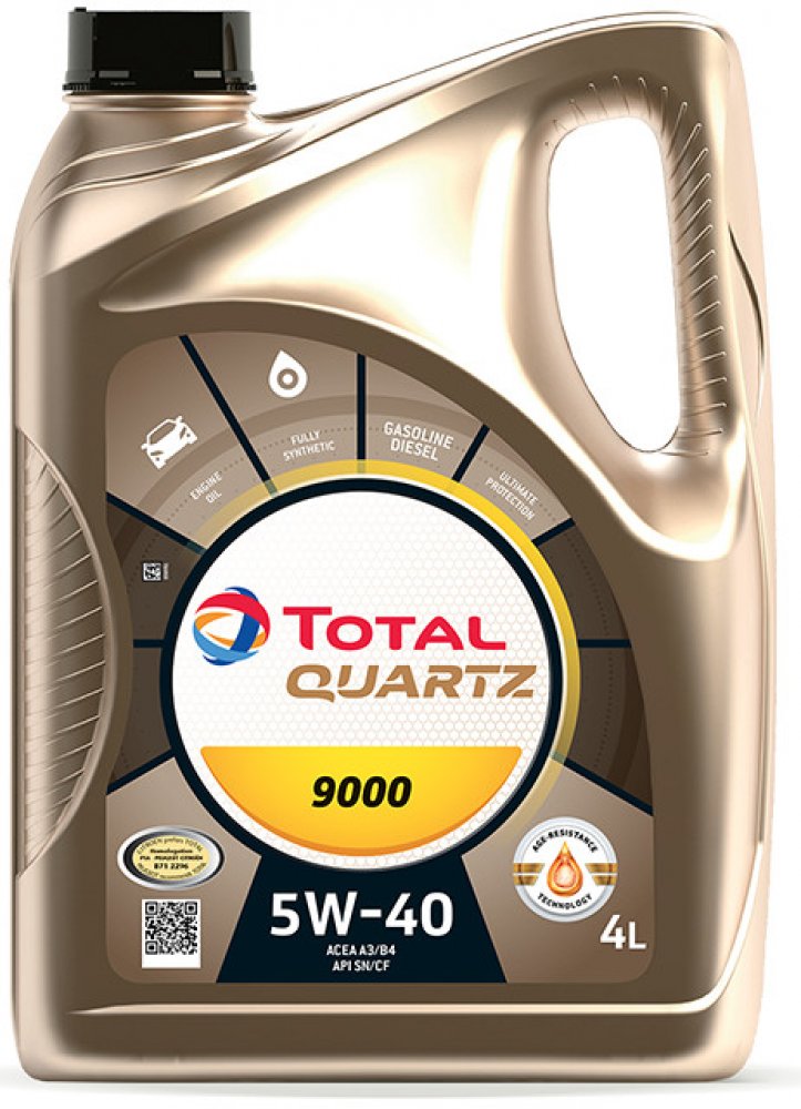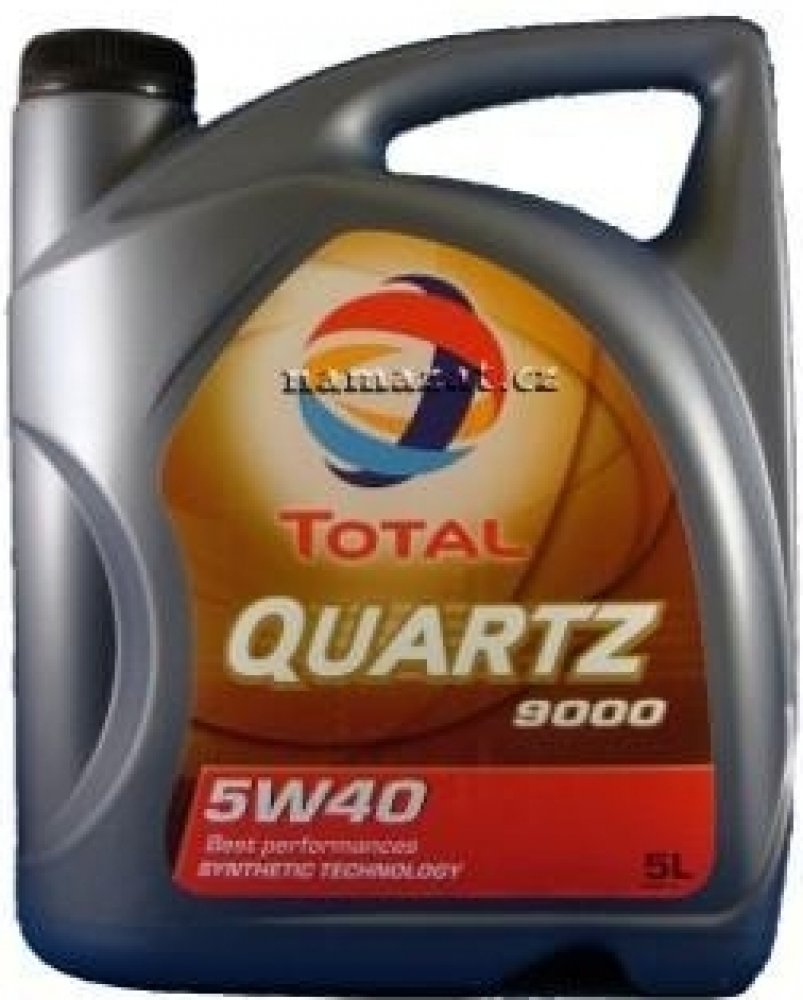 TOTAL QUARTZ 9000 5W-40 byl vyvinut na základě nejnáročnějších požadavků současných benzínových a dieselových motorů (od r.2000) osobních vozidel.Je zvláště vhodný pro přeplňované, víceventilové motory a motory s přímým vstřikovacím systémem.Lze použít i v nejnáročnějších provozních podmínkách (rychlý dálniční provoz, intenzivní městský provoz) v každém ročním období.Výborně je přizpůsoben pro automobily s katalyzátorem provozované na bezolovnatý benzín nebo zkapalněný zemní plyn (LPG).