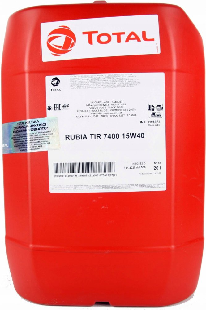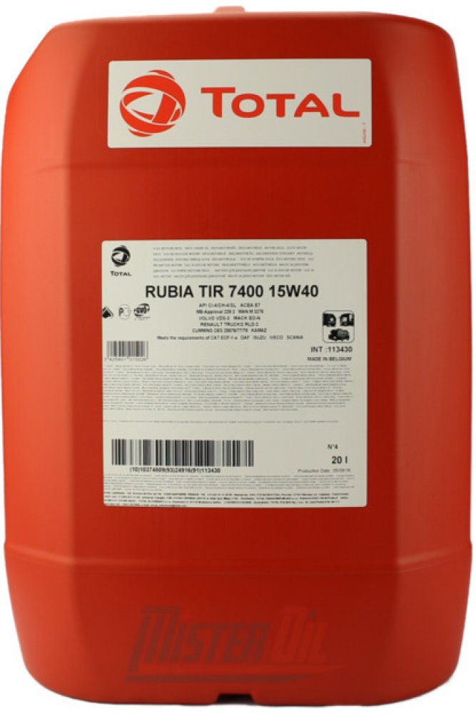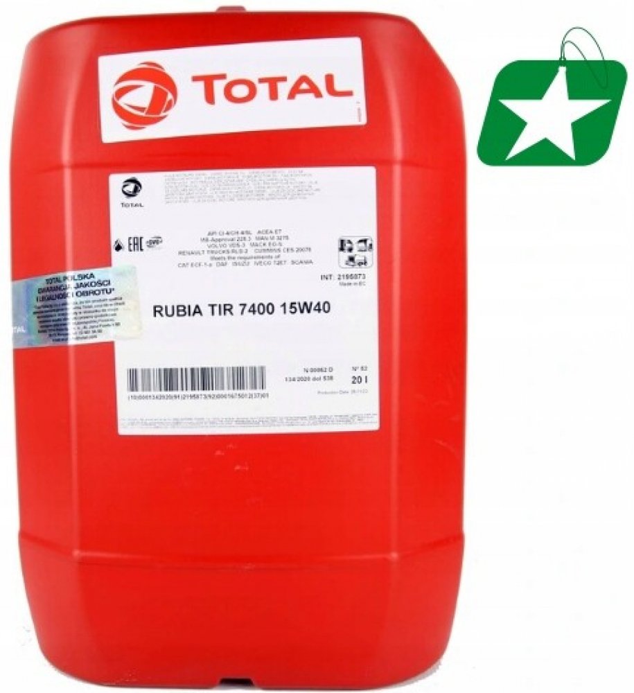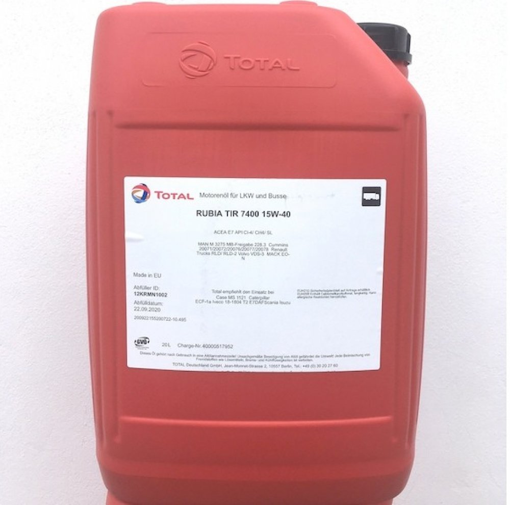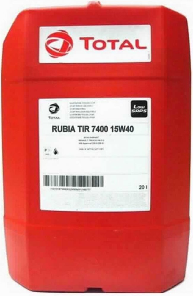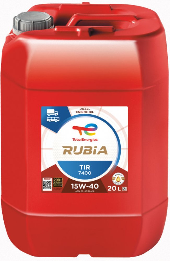 Total Rubia TIR 7400 15W-40 je minerální mazivo určené pro dieselové motory používané v silniční dopravě. Je doporučeno pro motory splňující normy Euro 3 a starší, a to od většiny evropských a amerických výrobců. Díky své adaptabilitě je také vhodné pro některé motory splňující normy Euro 5 a starší, pokud jsou dodržovány vhodné intervaly výměny oleje. Tento produkt umožňuje pokrytí flotil s různými značkami (americkými i evropskými) s minimálním počtem produktů.