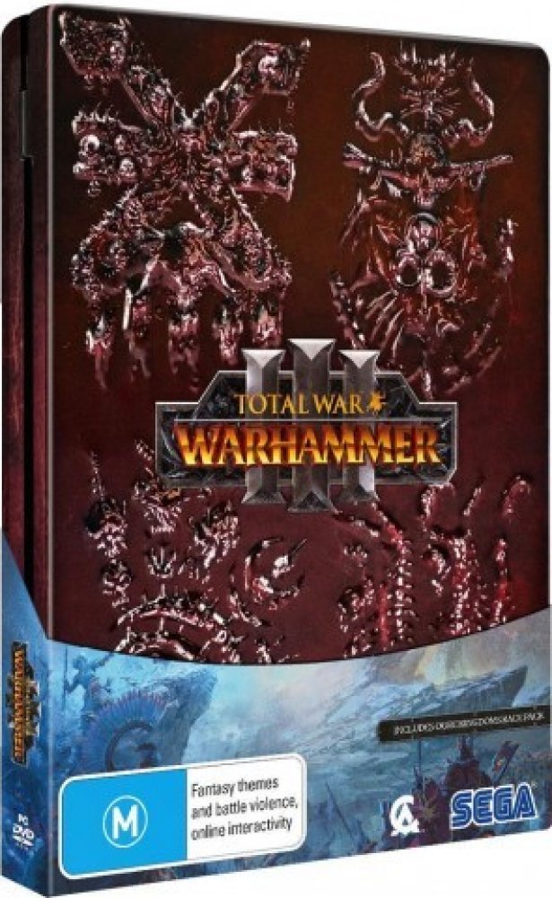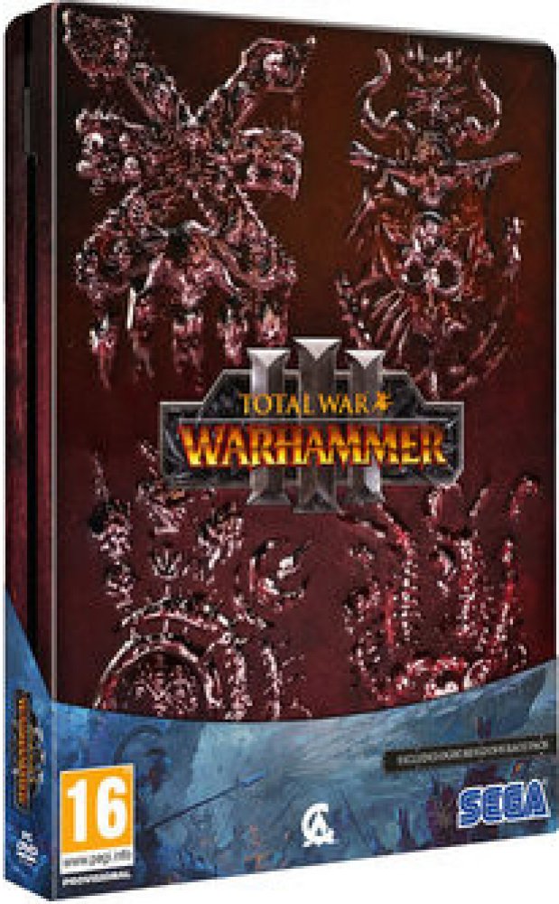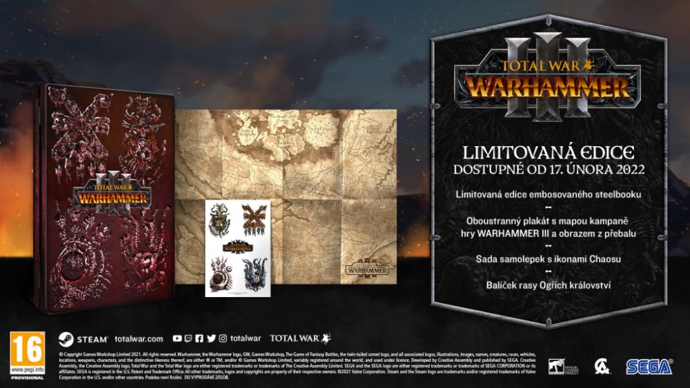 LIMITOVANÁ EDICE OBSAHUJE - kód na stažení hry Total War: WARHAMMER III - limitovaný embosovaný Metal Case - oboustranný plakát s mapou kampaně hry Warhammer III a obrazem z přebalu h...