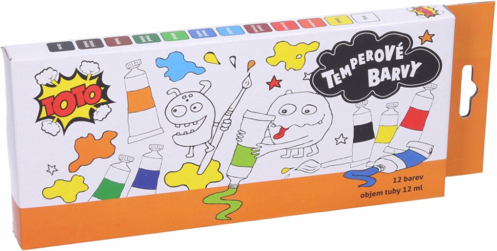 Temperové barvy TOTO v tubách se snadno nanáší, dobře kryjí a jsou světlostálé. Snadno se míchají a vytváří tak celou škálu dalších odstínů a barev. Barvy jsou vodou ředitelné a velmi dobře schnou. Po zaschnutí jsou znovu rozmalovatelné vodou. Díky šroubovacímu uzávěru jsou barvy chráněny před vyschnutím a vytečením.
