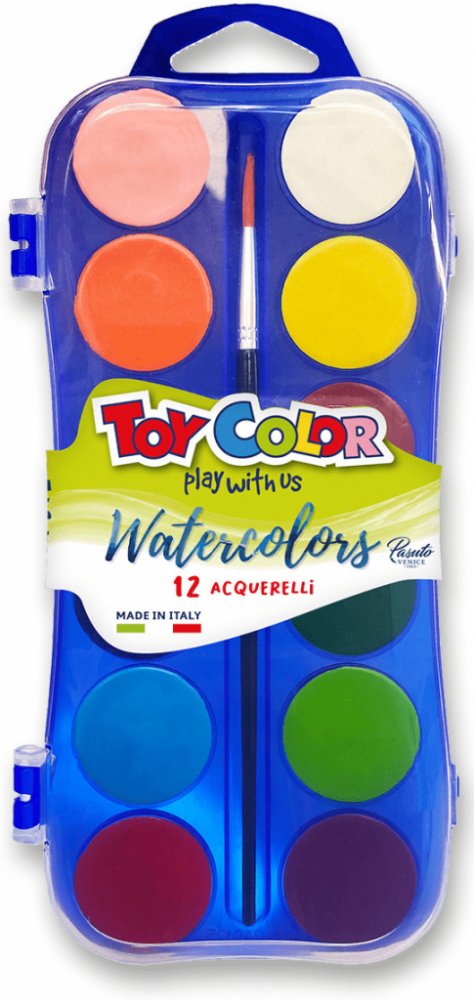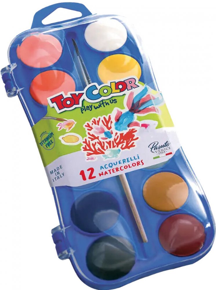 Vodové barvy Pasuto Toy Color jsou vyrobené pomocí exkluzivního technologie zvané „studené vstřikování“. Vodovky nabízejí krémovou texturu a výjimečné chromatické provedení, které umožňuje vytvářet tisíce odstínů. Každá z 12 barev má průměr 30 mm a víčko slouží díky dutinám jako malířská paleta.