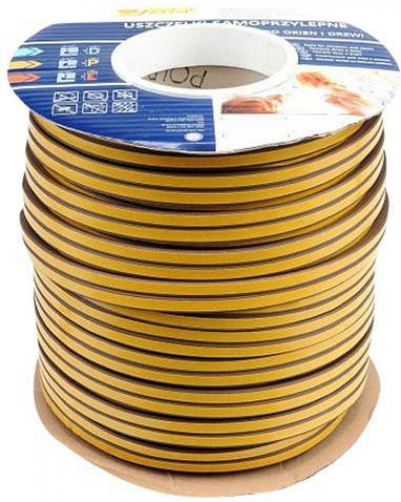 Těsnění do oken a dveří samolepící 9x7,4mm TYP D hnědé 100m Samolepicí těsnění do oken a dveří, vyrobeno z pryže s elastomerem EPDM, která má velmi dobrou odolnost proti povětrnostním vlivům, UV záření, vlivům vzduchu i vody. Těsnění je osazeno samolepící fólií vyztuženou skelným vláknem, zajišťuje účinnou ochranu proti zimě, větru, teplu, hluku, dešti i hmyzu. Toto těsnění umožňuje dosáhnout úspo...