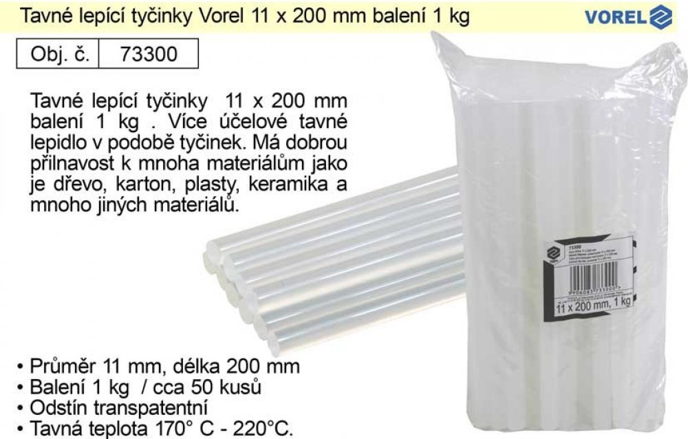 Tavné lepící tyčinky 11 x 200 mm balení 1000 g. Více účelové tavné lepidlo v podobě tyčinek. Má dobrou přilnavost k mnoha materiálům jako je dřevo, karton, plasty, keramika a mnoho jiných materiálů. Tavná teplota 170° C - 220°C.