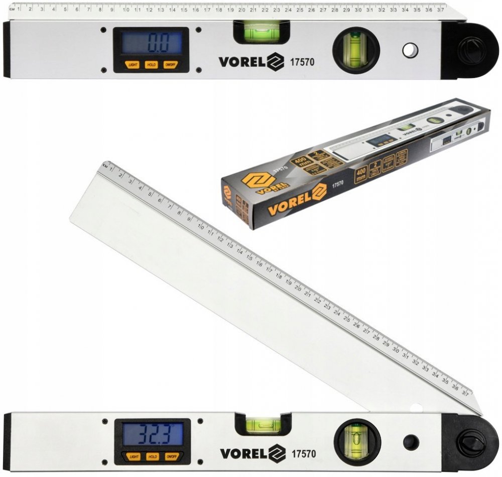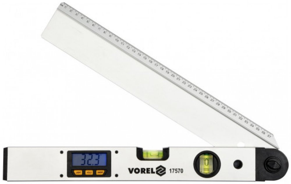 Tělo úhloměru je vyrobeno z hliníkového profilu opatřeného 2x libelami. S jejich pomocí můžeme přesně odměřit libolné úhly. Pohyblivá část má délku 400 mm a je opatřena milimetrovou stupnici.