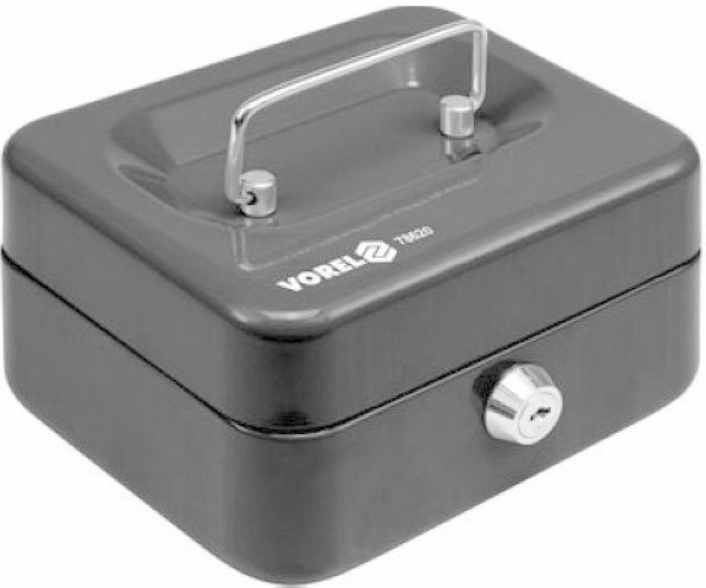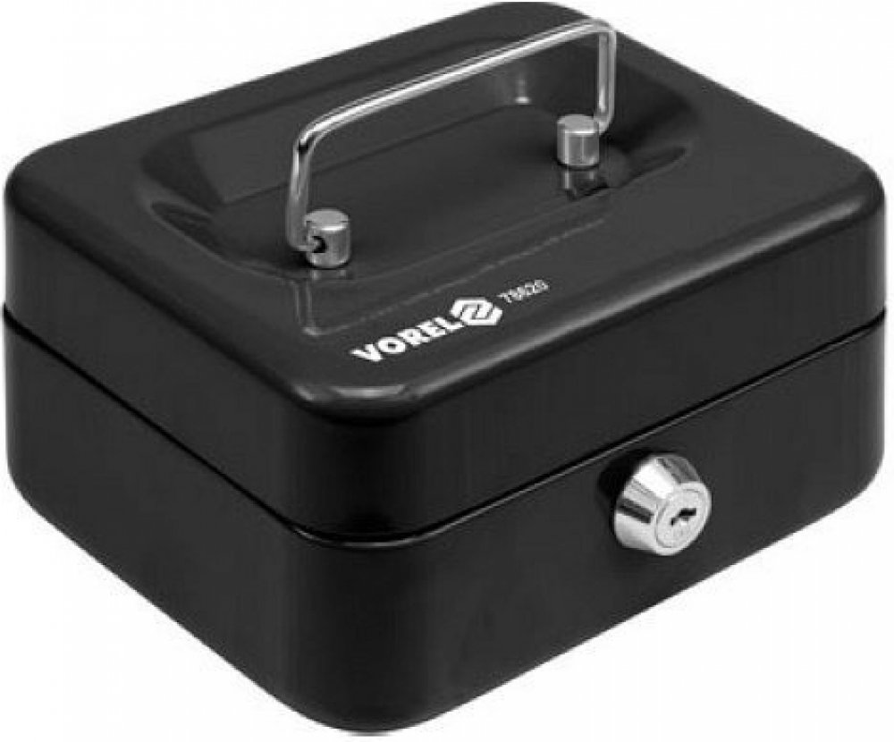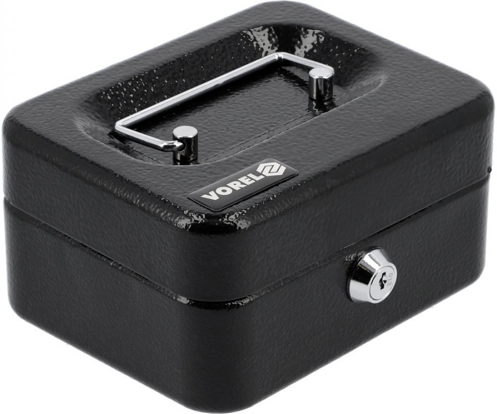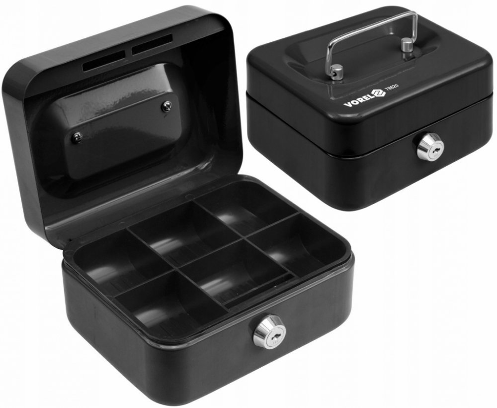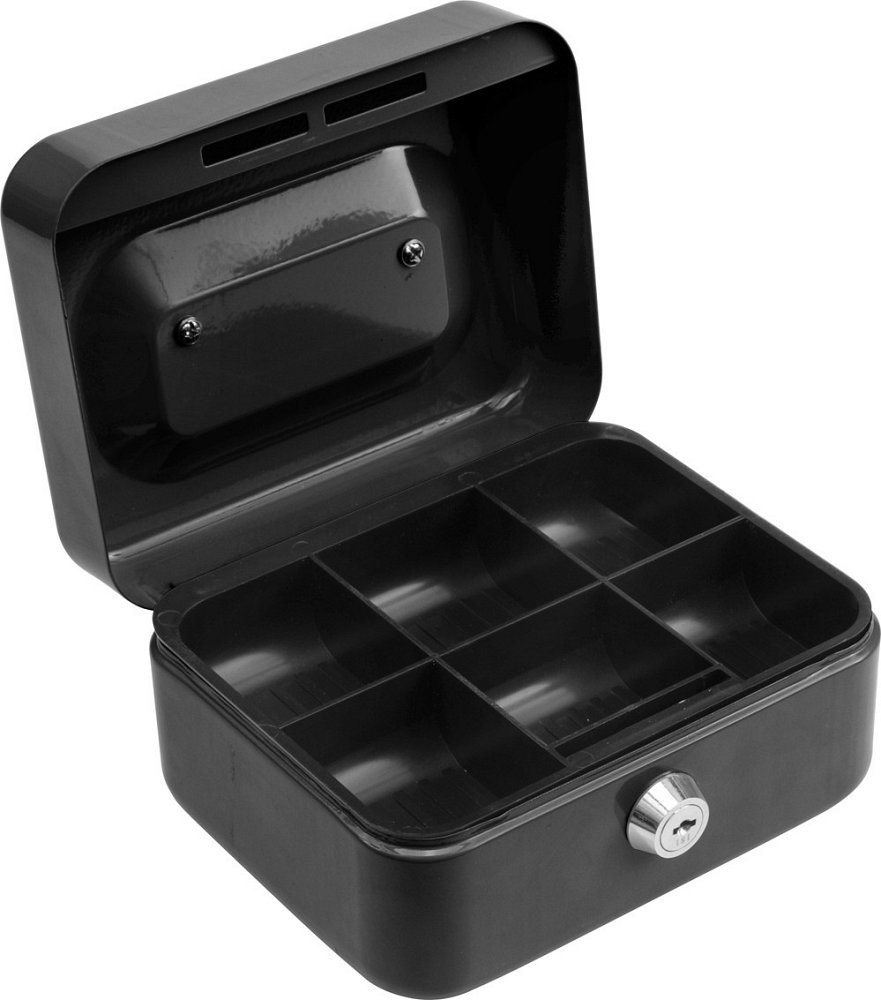 Přenosná pokladna o rozměrech 150x120x80mm. Vyrobeno z ocelového plechu o tloušťce 0,7 mm, černě natřeno. Zamykání na klíč. Sada obsahuje 2 klíče. Odnímatelná plastová vložka na mince uvnitř.