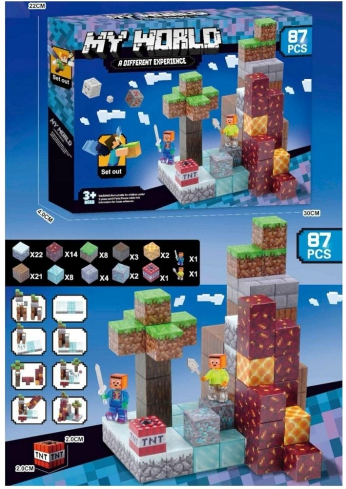Stavebnice obsahuje 85 pevných dílků s magnetickým spojem, díky kterému lze snadno stavět i přestavovat. Každý blok je detailně potištěn tak, aby co nejvěrněji připomínal textury z Minecraftu – od kostek lávy a zeminy po stromové kmeny a diamantové kry. Figurky jsou vybaveny meči a čekají na tvé příkazy.