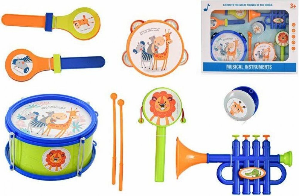 Vstupte do světa hudby a rytmu! Tato sada hudebních nástrojů je ideální pro malé muzikanty od 3 let a obsahuje celkem 7 barevných nástrojů – například bubínek s paličkami, trubku, tamburínu a kastaněty .