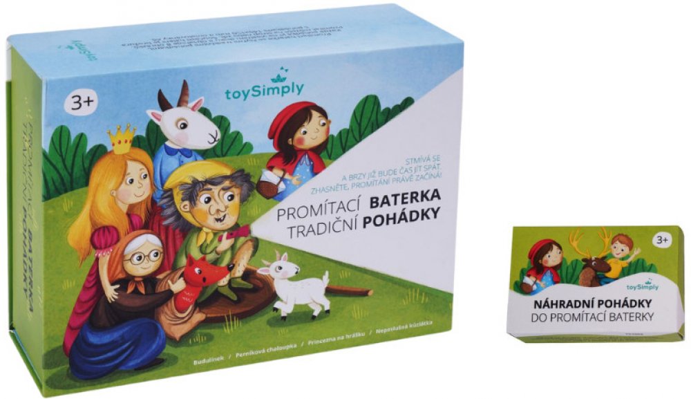 Dětská pohádková baterka na promítání pohádek s celkem 8 pohádkami v akčním setu. Klasické české pohádky, které všichni známe a máme je rádi. S kvalitou pohádkové baterky bylo spokojeno celkem 93% všech uživatelů zapojených do programu TESTUJ TO. Ilustrace od české autorky Zuzany Korčákové. Balení obsahuje omalovánky s obrázky z pohádek. SADA obsahuje:Dětská promítací baterka 4 tradiční pohádkyDětská pohádková svítilna, která by neměla chybět v žádném dětském pokoji.Chcete svým dětem představit klasické česko-slovenské pohádky, které znaly naše babičky a dědečkové?Pak je pro Vás tato svítilna naprosto ideální.Je velmi praktická, snadno se drží i v dětských rukou, práce s kotoučky je velmi jednoduchá.V balení najdete čtyři pohádky: Budulínek, Perníková chaloupka, Princezna na hrášku a Neposlušná kůzlátka.Každá pohádka má 8 obrázků.A pokud jste již pohádku zapomněli? Nevadí, v balení je brožura v českém jazyce, ve které se o každé pohádce dozvíte.Ale to není všechno - v balení najdete také pohádkové omalovánky.Pohádky ilustrovala známá česká ilustrátorka Zuzana Korčáková, která se specializuje na dětskou kresbu.Takže zhasněte světlo v pokoji, zaostřete obrázek a promítání může začít. Projekce je vhodná na bílou stěnu.A pokud chcete další pohádky, není nic jednoduššího než si objednat další pohádkové kotouče!Rozměry balení: 22 cm x 17 cm x 8 cm.Baterie jsou součástí balení - 2 x AAA baterie. Diskety s pohádkami do promítací baterkyNáhradní diskety s pohádkami do dětské promítací baterky. V tomto balíčku najdete pohádky: Smolíček, Hrnečku vař, Červená Karkulka a Šípková Růženka.Rozměry balení: 6 cm x 4,5 cm x 2 cm. Vhodné pro děti od 3 let.