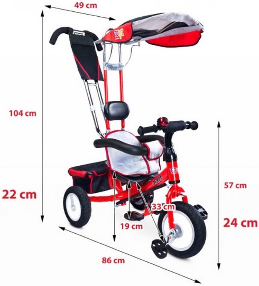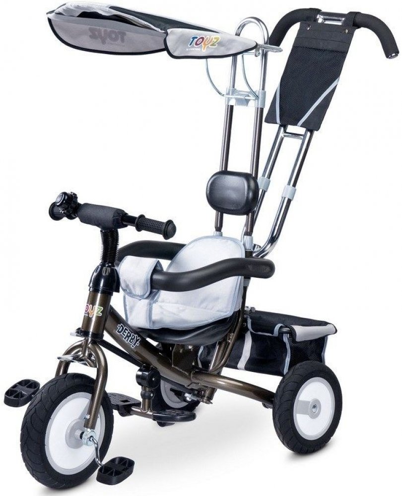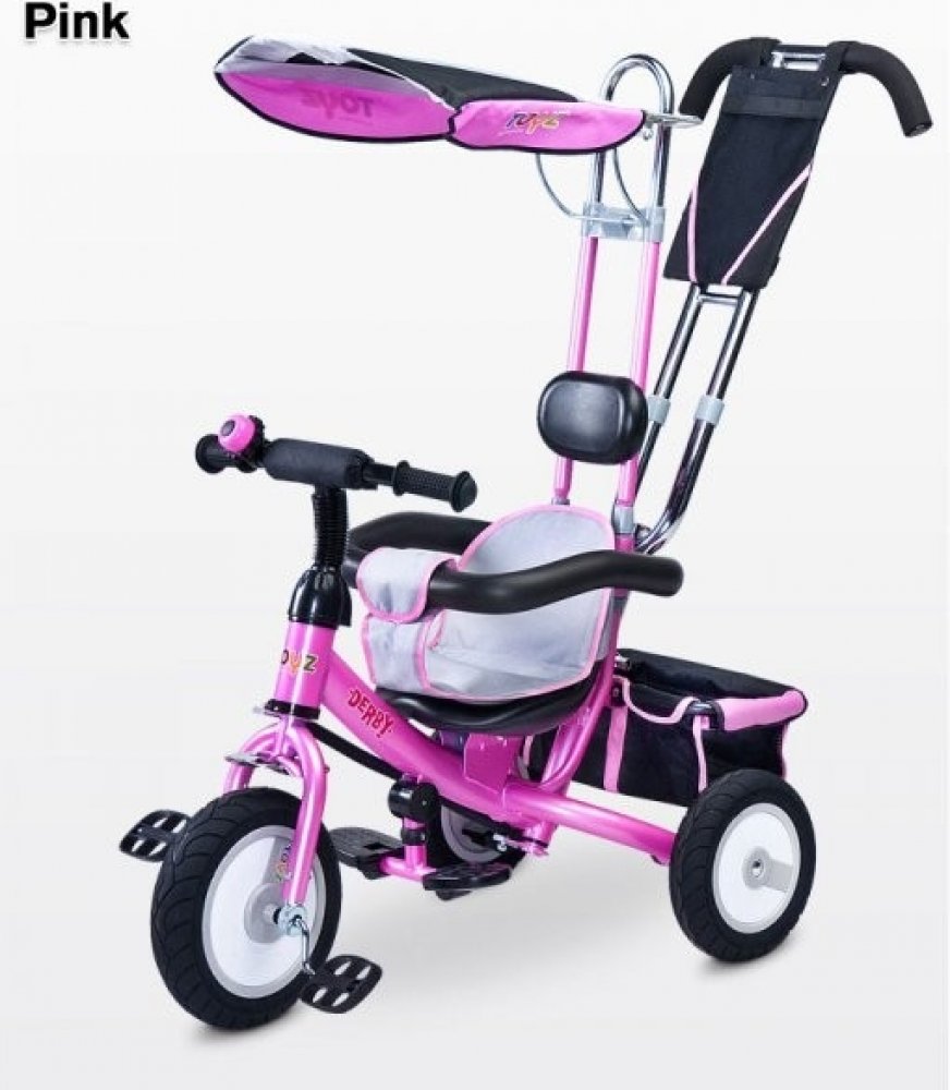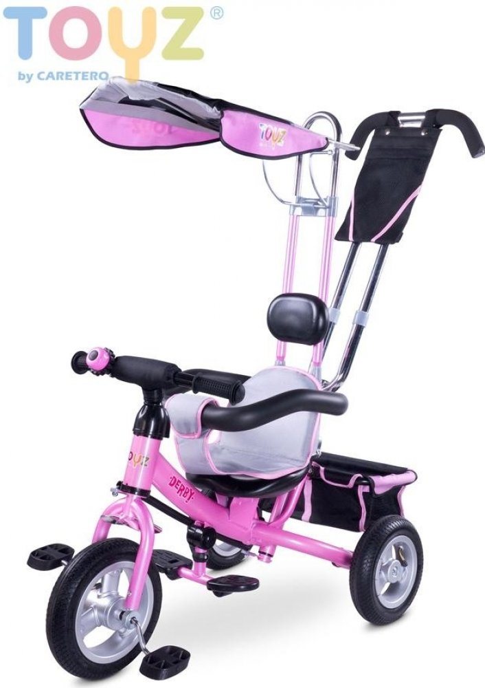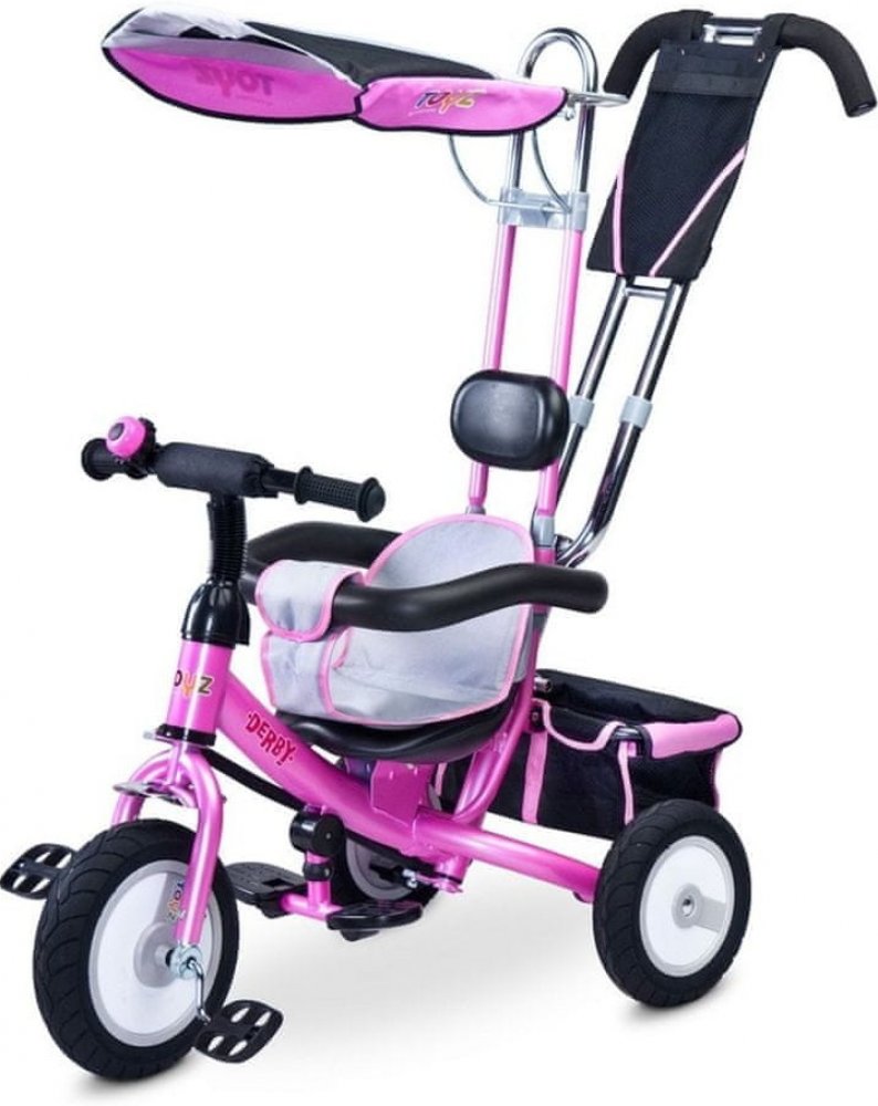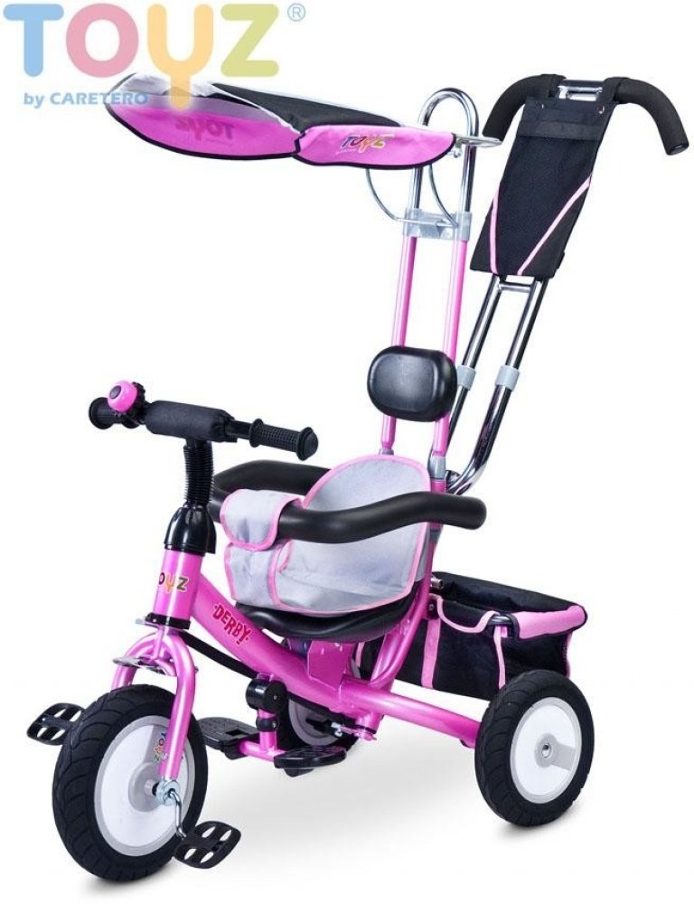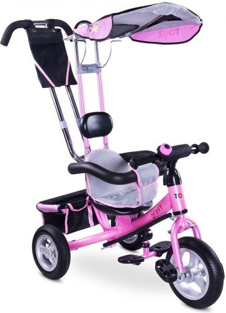 Dětská šlapací tříkolka Toyz Derby.Charakteristika:- pro děti 3-5 let- nosnost 25 kg- zvonek na řídítkách - gumová kola- kovová konstrukce - stříška- odnímatelný košík na hračky- měkká látková vložka na sedadlo- polstrovaná opěrka hlavy- pohodlné madloRozměry:- vxšxd cca 86x49x104 cm- váha 10,8 kg- přední kolo cca 24 cm- zadní kolo cca 22 cm- rozměry balení 57x27x41 cm