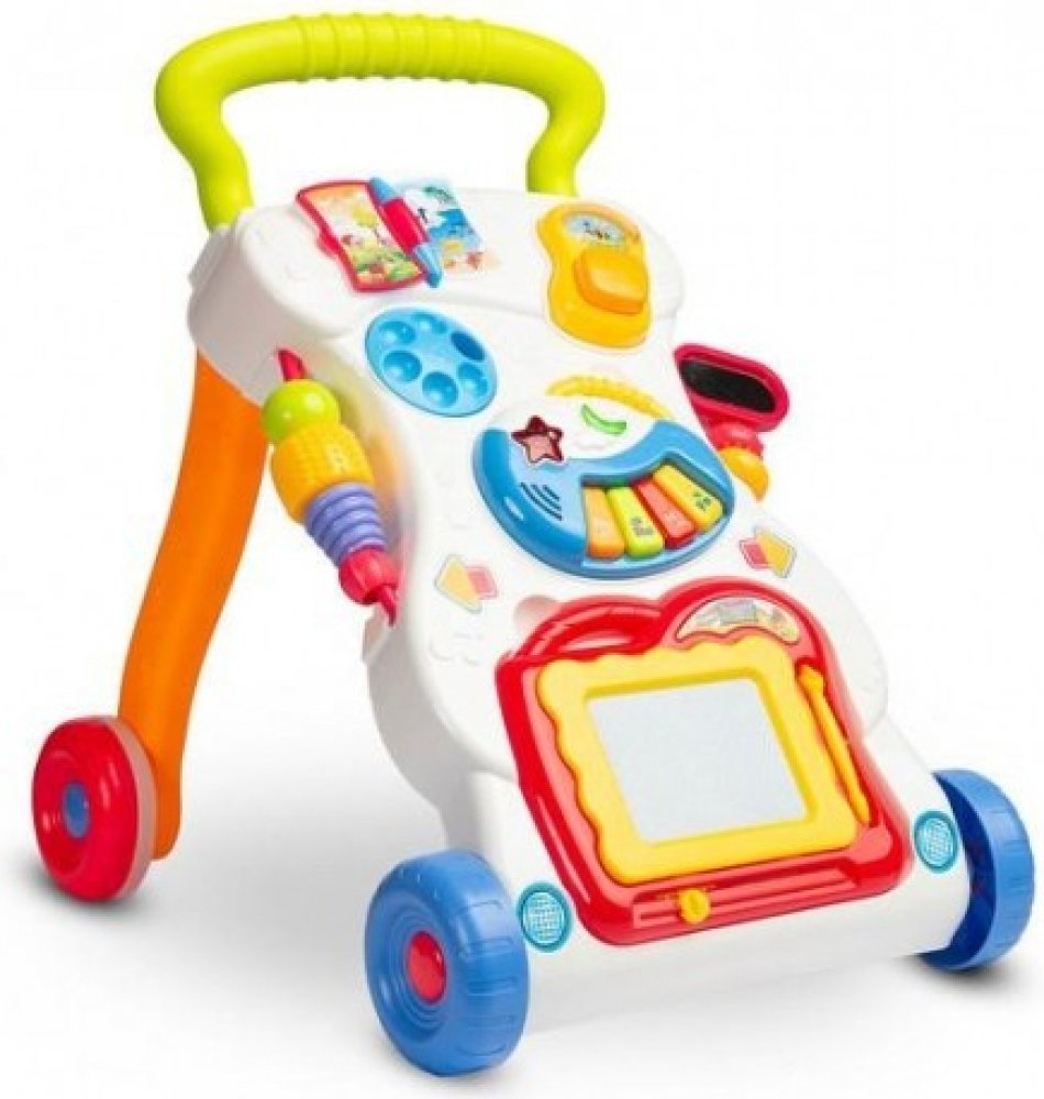 Hračka má pozitivní vliv na kognitivní vývoj díky prvkům, které v miminku probudí zvědavost. Kromě různých motorických hraček má také odnímatelný telefon, kreslící prkno a bateriově napájenou svítící hudební hračku, která poskytuje spoustu možností hraní. Posunovač dokáže nastavit odpor kol pomocí šroubováku.