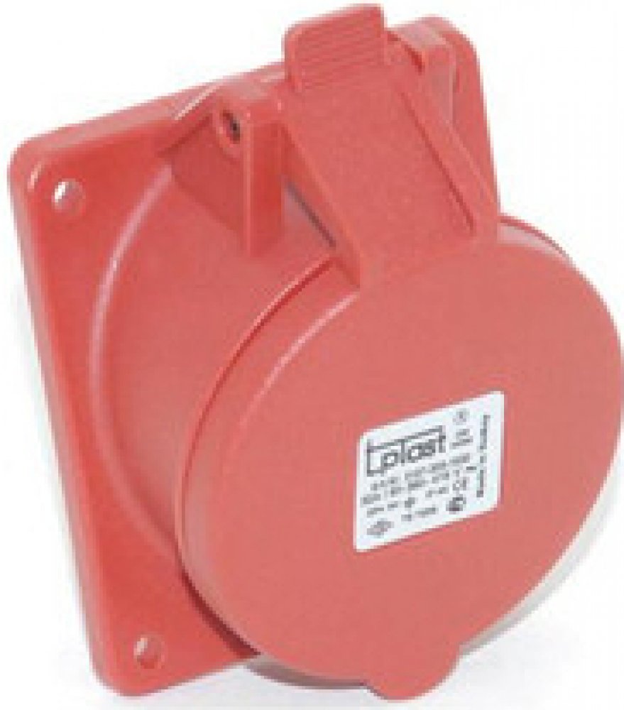 Zásuvka průmyslová 32A 4P 380V vestavná šikmá 3126-309-1600 IP44 TP electric. Průmyslové vidlice, průmyslové zásuvky, průmyslové přívodky a průmyslové zástrčky obecně řeší zapojení elektro zařízení na třífázový motorový proud na 380V. Používají se pro pevné nebo pohyblivé připojení stavebních a staveništních rozvaděčů, stavebních strojů a zařízení v průmyslu, strojírenství, zemědělství, dílnách a garážích. Dále se také používají k výrobě prodlužovacích kabelových přívodů na 380V pro stavební míchačky, cirkulární pily, štípaček na dřevo, elektrických bojlerů, elektrických třífázových motorů a dalšího nářadí a elektro zařízení a strojů na napájecí napětí 380V dnes již nově na napětí 400V - 415V.