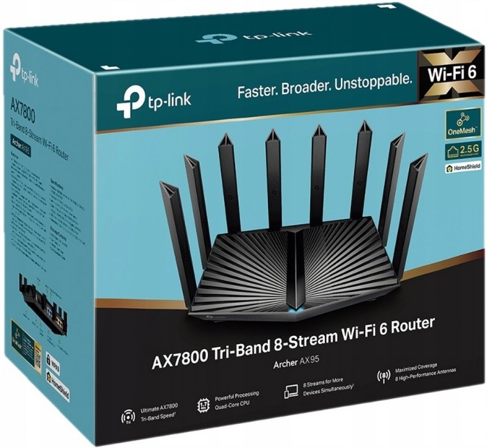 Router vám poskytne ohromující bezdrátovou rychlost, vysoký výkon, nízkou latenci a silnou ochranu proti rušení. Je totiž vybavený technologií WiFi 6. Využívejte všechna tři pásma systému WiFi 6 Mesh a dosáhněte rychlosti až 7,8 Gbps. Dopřejete si špičkový výkon bez přetížení sítě díky pokročilé čipové sadě Broadcom™ a vysokorychlostní paměti 512 MB.