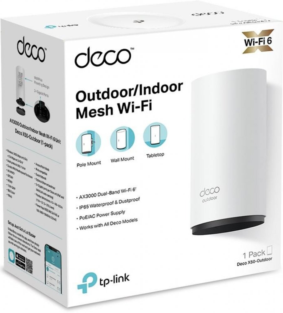 - Kit k přichycení na zeď či trubkuDeco X50-Outdoor je první venkovní jednotka z oblíbené řady Deco pro zaručeně silný signál Wi-Fi na zahradě či terase vašeho domova. Bezdrátové připojení a volitelné propojení všech jednotek buď ethernetovým kabelem, bezdrátově nebo kombinovaně poskytují ještě vyšší síťovou rychlost a skutečně bezproblémové pokrytí. Chcete více pokrytí? Stačí přidat další jednotku Deco.