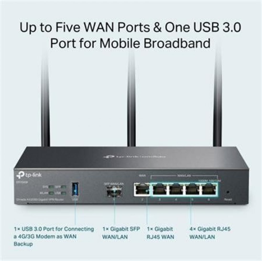 Router je vybaven 1 gigabitovým SFP a 5 gigabitovými RJ45 porty, které splňují různé požadavky na připojení k internetu. Funkce Multi-WAN Load Balancing rozdělí datové toky podle podílu šířky pásma každého portu WAN, aby se zvýšila míra využití širokopásmového připojení. Port USB 3.0 poskytuje vyšší přenosovou rychlost pro mobilní připojení.