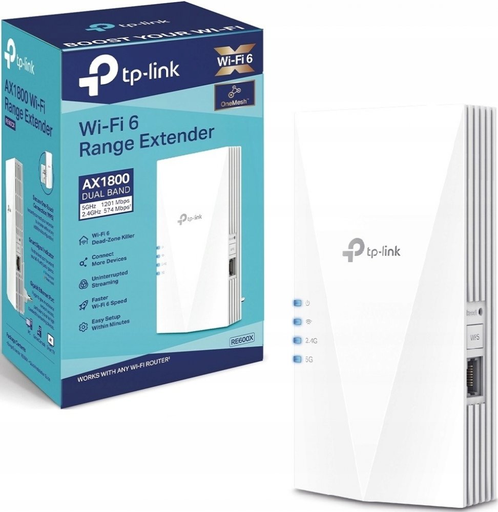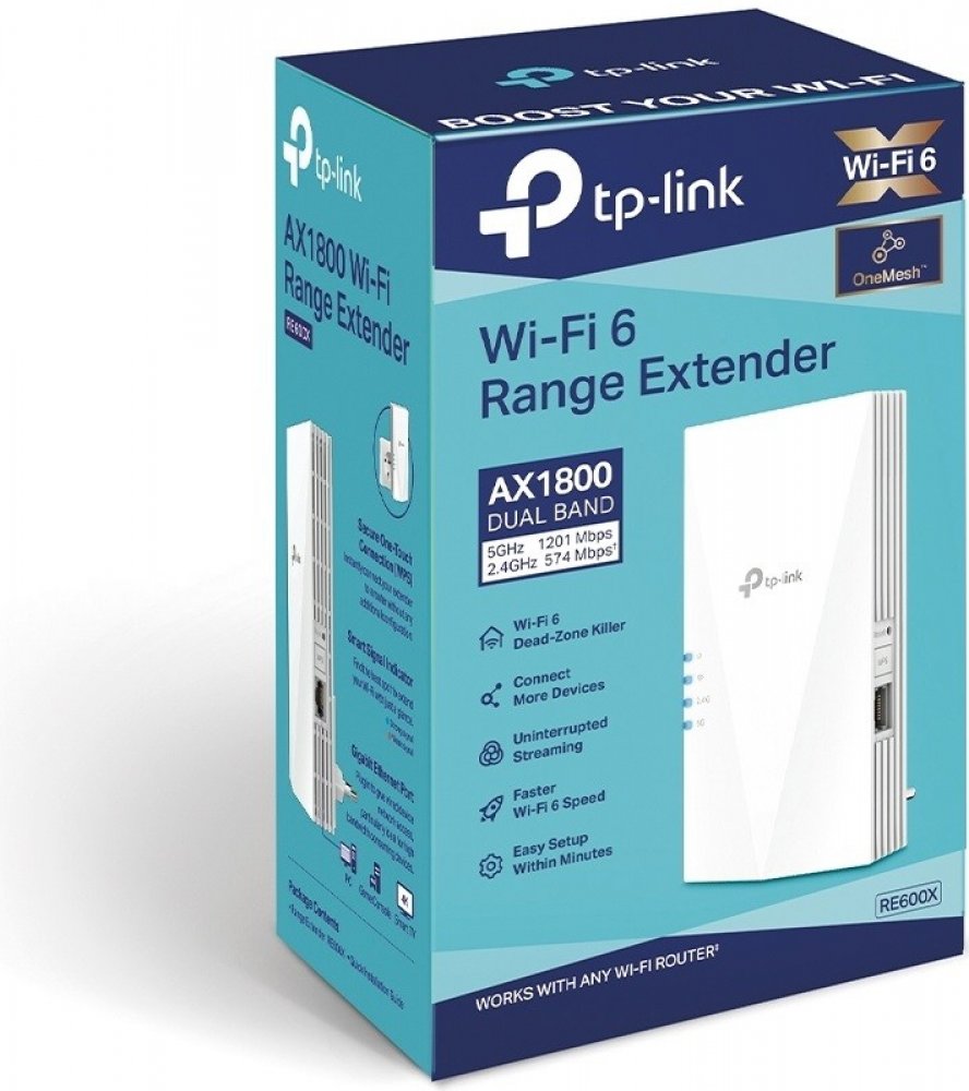 TP-Link RE600X. Model: Síťový vysílač a přijímač, Rychlost přenosu dat: 1201 Mbit/s, Přenosová rychlost sítě Ethernet: 10,100,1000 Mbit/s. Typ antény: Vnitřní, Vysílací výkon (CE): 2.4 GHz ≤20dBm, 5 GHz ≤30dBm. Technologie kabeláže: 10/100/1000Base-T(X), Síťové standardy: IEEE 802.11a, IEEE 802.11ac, IEEE 802.11ax, IEEE 802.11b, IEEE 802.11g, IEEE 802.11n, Standardy Wi-Fi: 802.11a, 802.11b, 802.11...