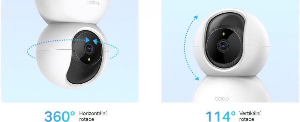 Video s rozlišením 1080 p můžete nahrát z různých úhlů, kamera totiž zvládá 360° horizontální rotaci a 114° vertikální posun. Také můžete využít funkce videa v reálném čase, obousměrný zvuk (mikrofon i reproduktor), nebo praktickou aplikaci Tapo Camera.