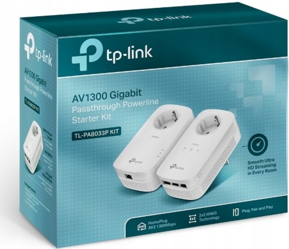 Startovací sada průchozích powerline adaptérů TP-Link TL-PA8033P KIT obsahuje