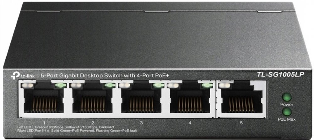 Switch nabízí 5 portů GbE RJ-45, z toho 1 PoE++ vstup a 4 PoE+ výstupy s celkovým výkonem 66 W. Podporuje datový a napájecí přenos na vzdálenost až 250 m. Má kapacitu 10 Gbps, tichý provoz a snadnou instalaci bez potřeby konfigurace.