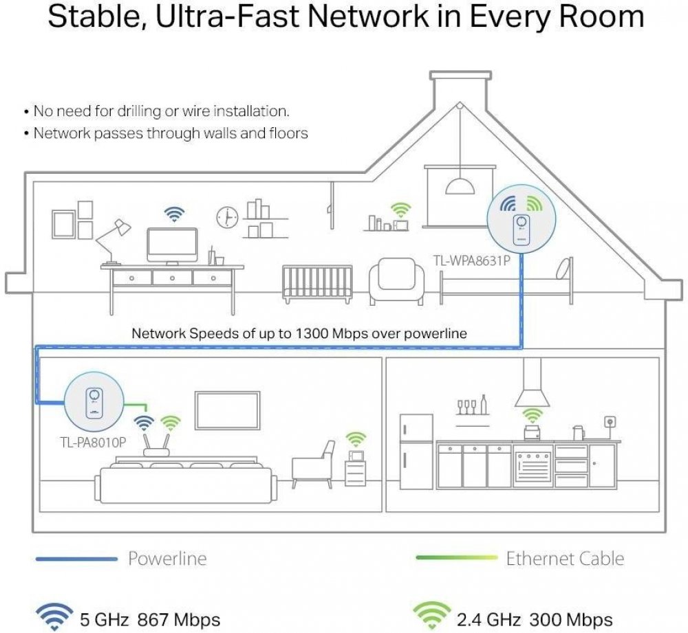 Můžete vytvořit dvoupásmovou Wi-Fi síť (souběžná rychlost přenosu dat 300 Mb/s v pásmu 2,4 GHz a 867 Mb/s v pásmu 5 GHz) s větší šířkou pásma a menším rušením. Díky tomu bude výkon vaší Powerline sítě maximální. Sada je vybavena tlačítkem klonování Wi-Fi pro velké rozšíření dosahu, což znamená, že může automaticky zkopírovat identifikátor SSID a heslo vašeho směrovače. Tímto způsobem adaptér zjednodušuje konfiguraci Wi-Fi a umožňuje bezproblémový roaming v rámci domácí sítě.