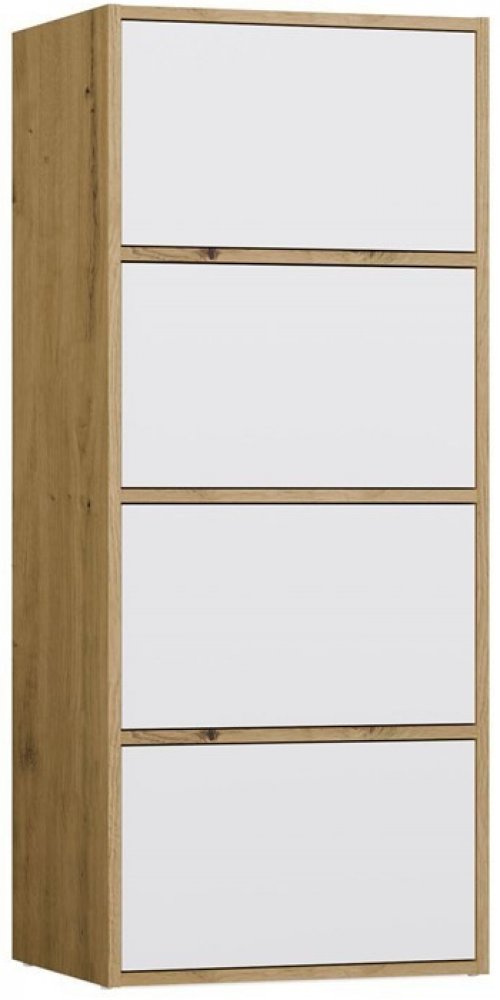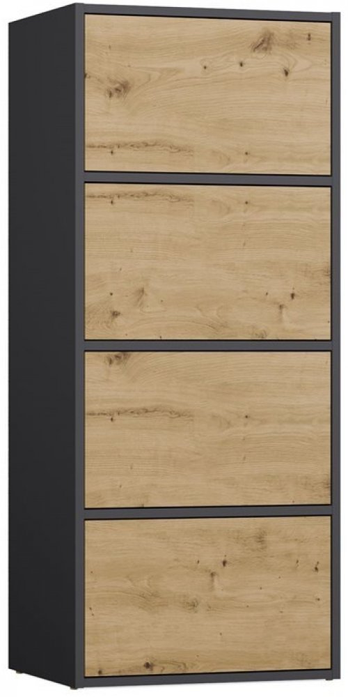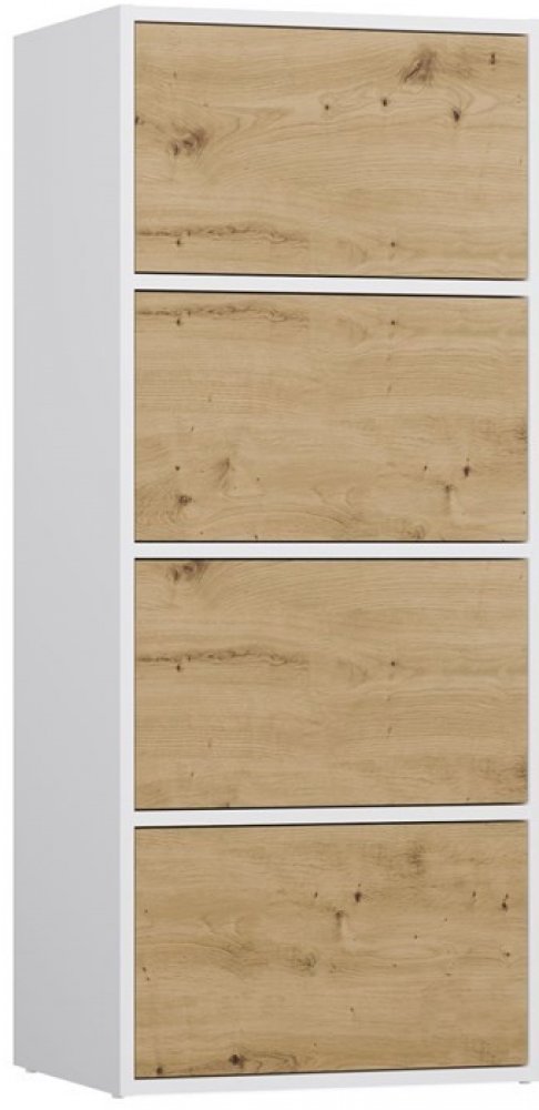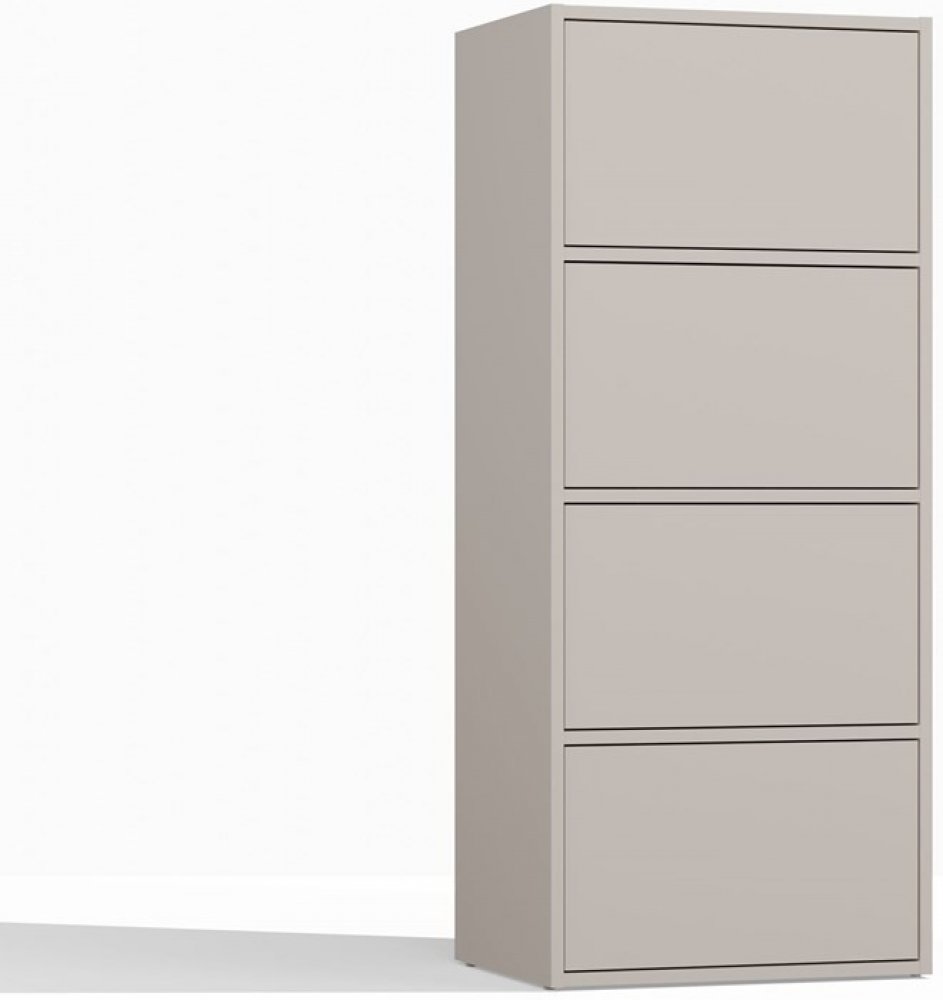Její vysoká štíhlá konstrukce působí subtilně, ale nabídne překvapivě mnoho místa. Čtyři dvířka se otevírají lehkým dotykem díky systému TIP-ON, takže komoda nepotřebuje žádné úchytky a zůstává dokonale čistá ve své formě. Vnitřní členění ukrývá tři praktické police, na které snadno uložíte cokoli, co chcete mít po ruce i elegantně schované – od dokumentů až po domácí textil.