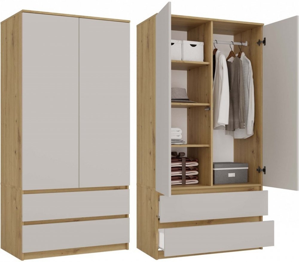 Šatní skříň do předsíně TAAVI umožňuje pečlivě organizovat prostor v místnosti. Uvnitř skříně naleznete tyč na ramínka a prostorné police, ve spodní části pak 2 praktické šuplíky. Rozměry:šířka: 90 cmvýška: 180 cmhloubka: 50 cm Další parametry a vlastnosti:police lze naistalovat na levou/pravou stranu dle vašich potřebkonstrukce: DTD o síle 16 mmkuličkové pojezdy zásuveksystém otevírání TIP-ON (dvířka se otevírají po jemném zatlačení čela pomocí mechanické podpory otevírání)hmotnost: 75 kgpočet balení: 3< vám dodáme demontované. V balení naleznete montážní návod a spojovací materiál. Šatní skříň MALWA SS-90 kombinuje moderní design s praktickou funkčností. Skvěle se hodí do ložnic, šaten, pokojů pro mladé nebo domácích pracoven. Teplý dub Artisan a hladká kašmírová čela vytvářejí stylovou atmosféru.Praktický interiér:Tyč na oděvy pro kabáty, bundy a košile5 polic na oblečení, dokumenty nebo úložné boxy2 prostorné zásuvky na spodní prádlo a věci denní potřebyBezúchytková čela se systémem TIP-ON - snadné otevírání a zavírání stisknutím tlačítkaMain features:Dostatek úložného prostoru: tyč na oblečení, police a zásuvkyModerní design: dub Artisan s kašmírovými čelyPohodlné otevírání: systém TIP-ON bez úchytekRobustní konstrukce: 16 mm laminovaná dřevotříska, odolná proti poškrábáníMateriál:Korpus a čela: Materiál: laminovaná dřevotříska (16 mm)Zásuvky: laminátová deska (laminátová deska): Zásuvky: na válečkových pojezdech pro hladké otevíráníKolejnice na oděvy: kovováRozměry:Šířka: 90 cmVýška: 180 cmHloubka: 50 cmPokyny pro údržbu: Čistěte měkkým hadříkem, nepoužívejte agresivní čisticí prostředky.Rozsah dodávky:Šatní skříň MALWA SS-90 k montáži svépomocíPodrobný návod k montážiKompletní montážní materiál
