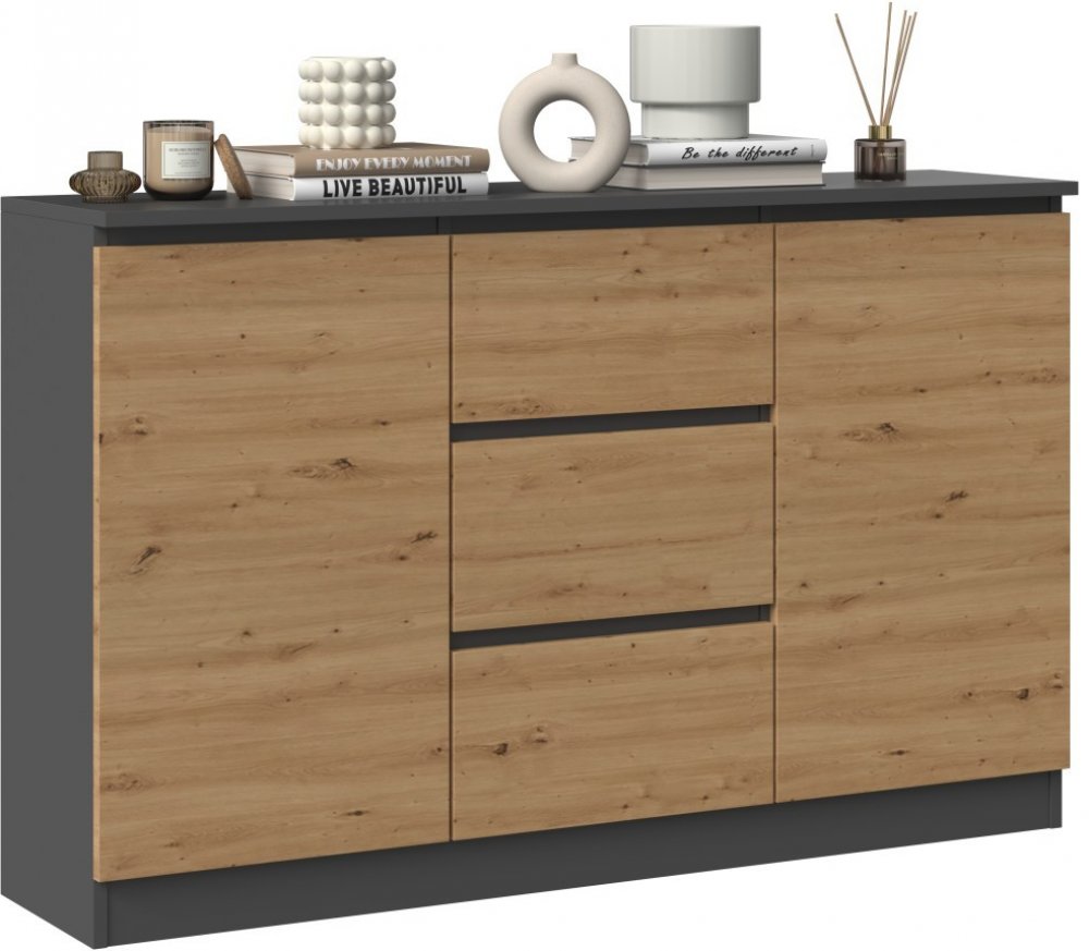 BARVA: ANTRACIT / DUB ARTISANModerní komoda 2D3S je funkční a prostorný kus nábytku, který ozdobí interiér vaší ložnice, obývacího pokoje nebo dětského pokoje.Univerzální vzhled splní očekávání každého, kdo ocení kombinaci jednoduchosti a elegance.Vnitřek komody tvoří police a tři šuplíky, které pomohou při zařizování věcí. Bude snazší najít to, co hledáte.PROVEDENÍ:Minimalistický designBezúchytko...