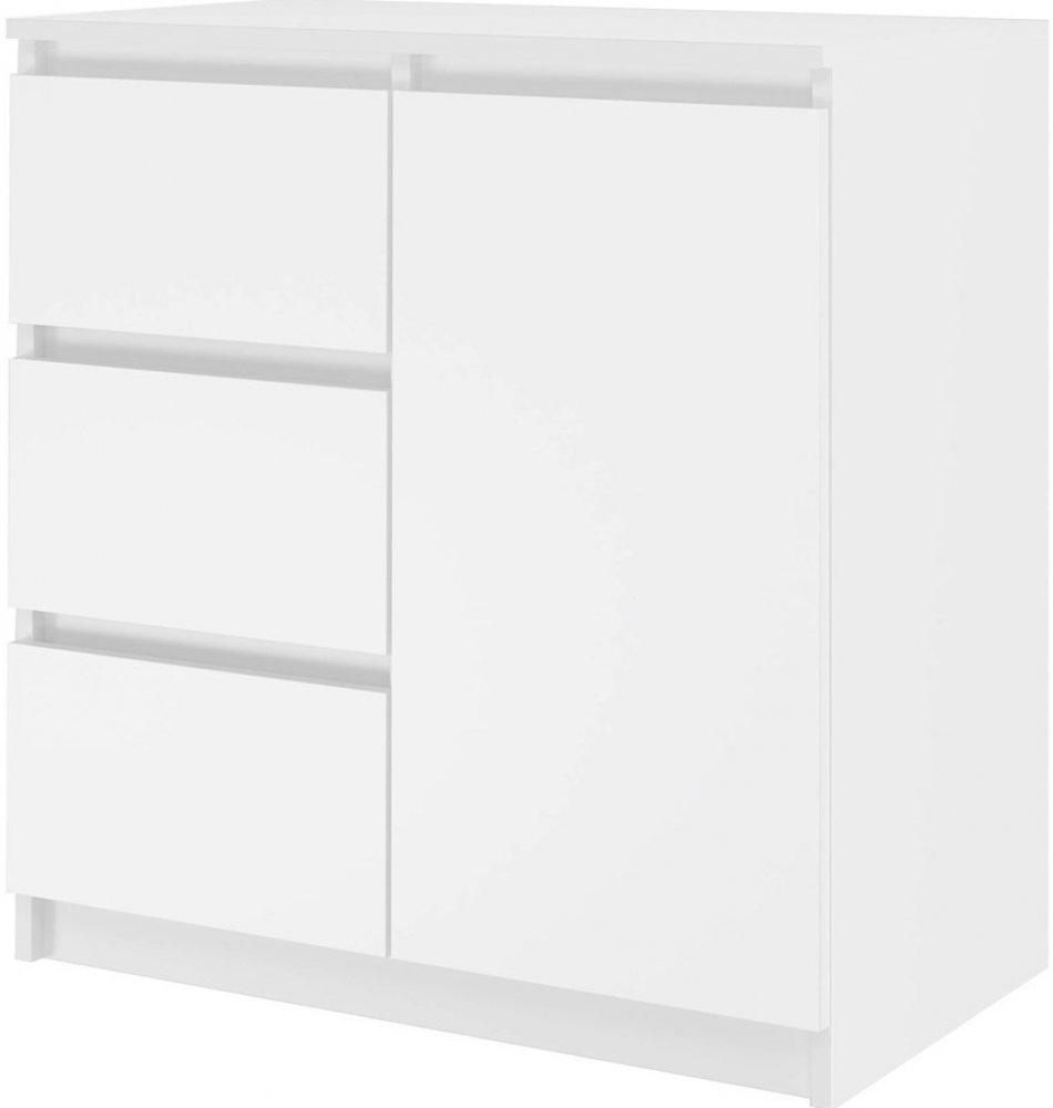 Tato moderní komoda se vyrábí z kvalitních materiálů, které jsou pevné a odolné, což jim dodává stabilitu. Zde jde o kvalitní laminované dřevotřísky. V rámci úložného prostoru disponuje třemi praktickými šuplíky a jednou prostornou skříňkou, která se uzavírá klasicky dveřmi. Drobné úchytky celkově podtrhují vzhled a je ideální volbou pro prostorný interiér s elegantním designem. Dodáváno v demontu s nezbytným návodem na jednoduché a rychlé složení.