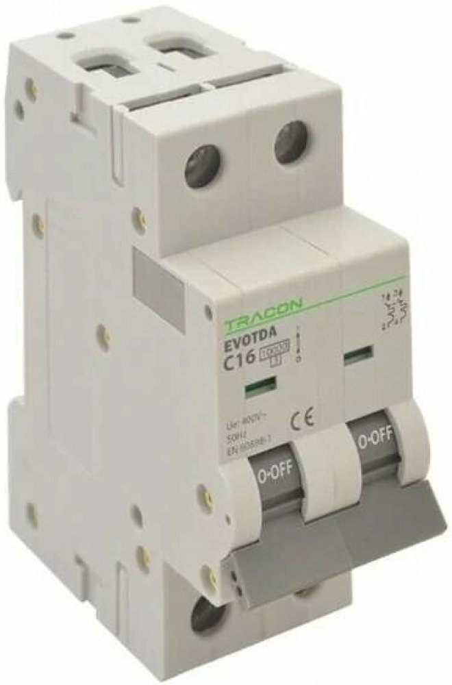 Dvoupólový jistič Tracon TDA-2C-63 na DIN lištu s charakteristikou zátěže C a maximálním proudem 63 A, zkratová schopnost 10 kA. Jistič slouží k ochraně elektrických obvodů proti přetížení a zkratu.