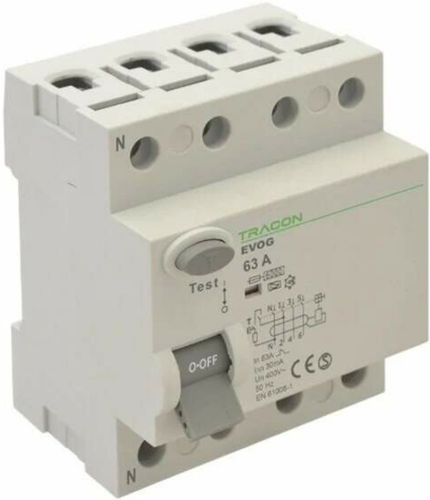 Proudový chránič Tracon EVOG4P253, 4-pólový s napětím 230 V, proudem 25 A, 300mA, zkratovou odolností 6 kA, zajišťuje efektivní ochranu proti nebezpečným elektrickým úrazům.