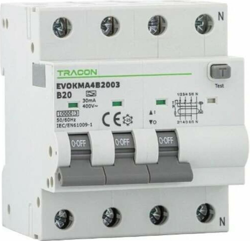 Kombinovaný proudový chránič Tracon EVOKMA4C201, 4-pólový, 4-modulový, s napětím do 230 V, proudem 20 A, 100mA, zkratovou odolností 10 kA, typ svodového proudu A, charakteristika C zajišťuje efektivní ochranu proti nebezpečným elektrickým úrazům.