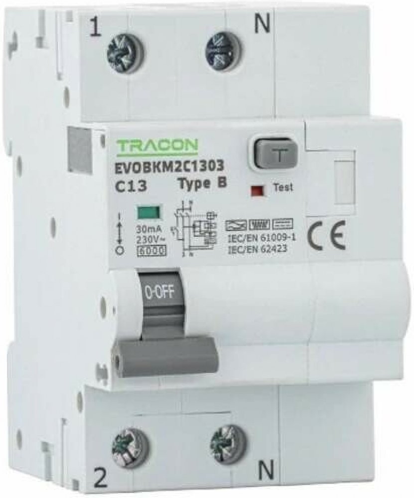Kombinovaný proudový chránič Tracon EVOBKM2C1003, 2-pólový, 3-modulový s napětím 230 V, proudem 10 A, 30mA, zkratovou odolností 6 kA, charakteristika C, typ svodového proudu B zajišťuje efektivní ochranu proti nebezpečným elektrickým úrazům.