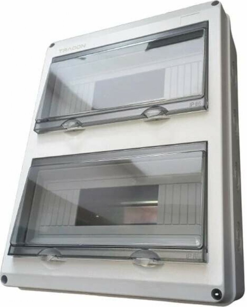 Venkovní nová nástěnná rozvodnice Tracon Tracon EDFKIP65U122 je elektrický rozvaděč na omítku s transparentními dvířky, rozměry 275,5x356,2x106,2 mm, DIN lišta s počtem řad 2 pro celkem 24 modulů, barva šedá, krytí IP 65, kvalitní UV stabilní materiál, barva šedá, 2×12 mod, H×W×D=356.16×275.51×106.2mm, IP65,1000VAC,1500 VDC