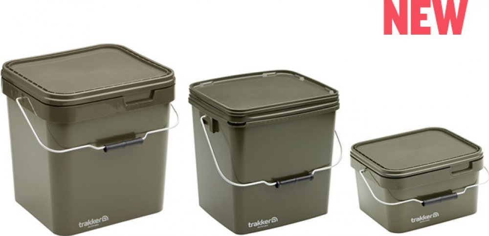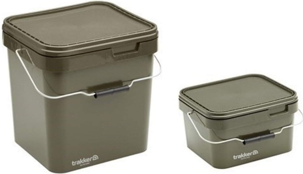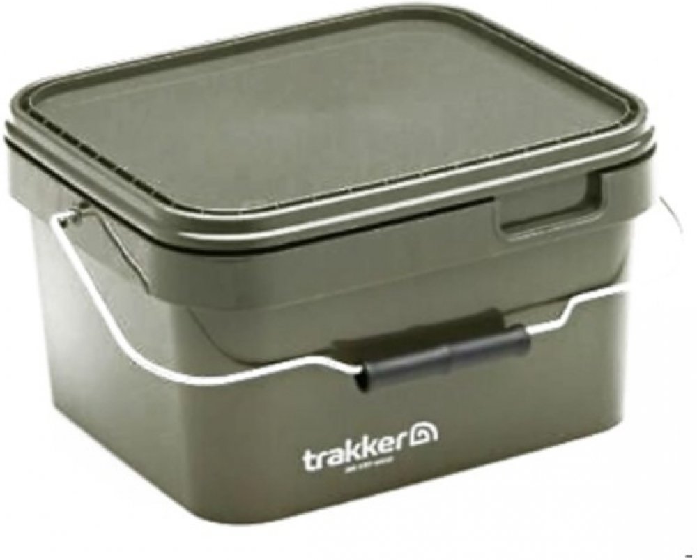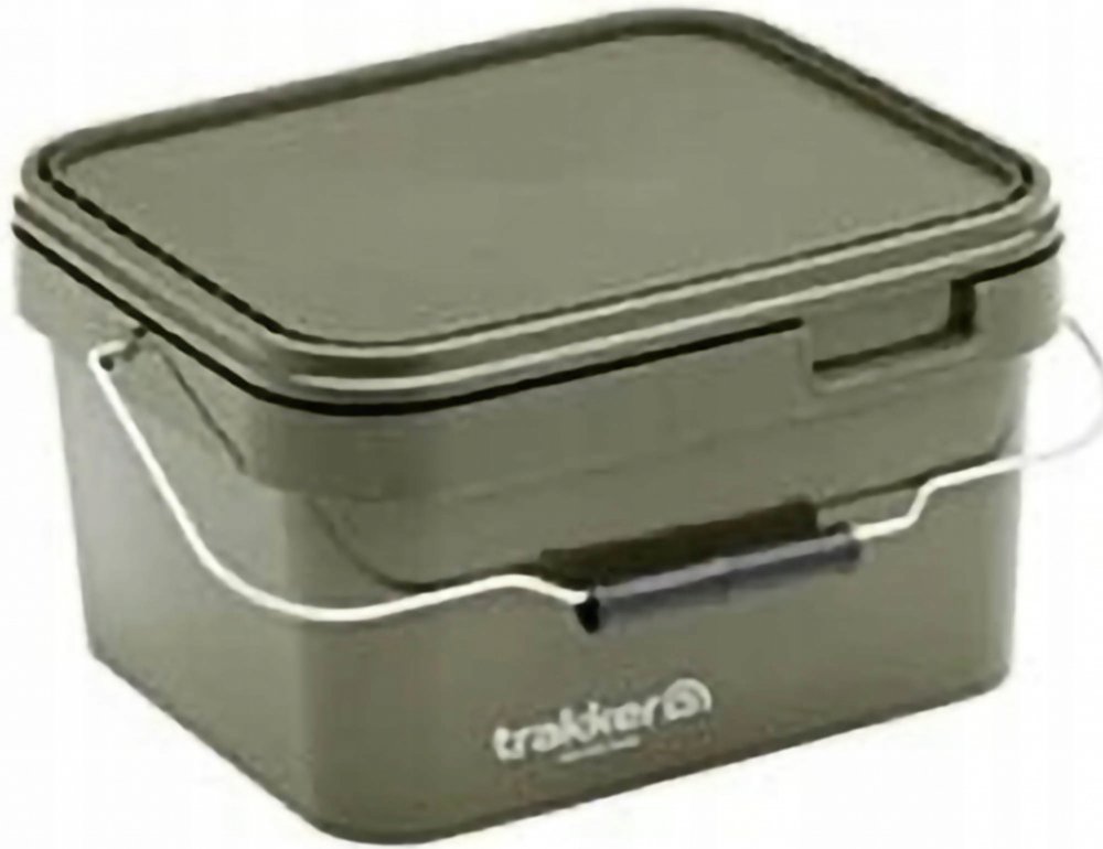 Plastový, pevný kbelík Trakker Olive Square Container v zelené barvě s kovovým úchytem a plastovým, černým madlem.