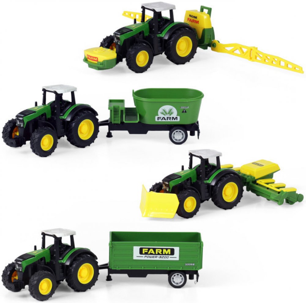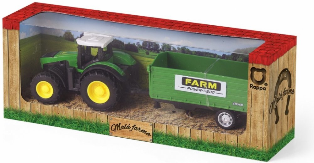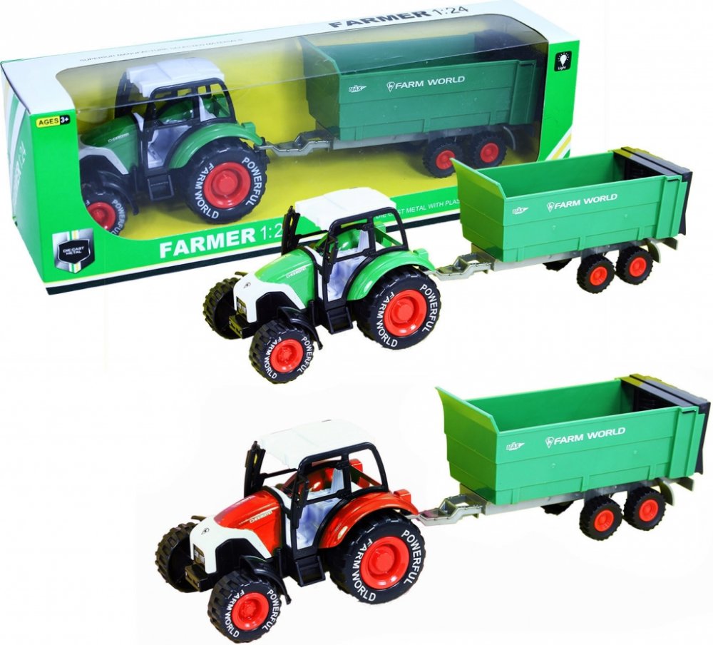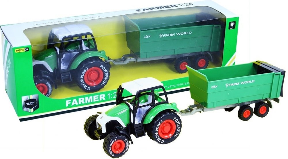 Hračka pro děti od 0 letTraktor FARMER v modelové velikosti 1:24 s přívěsem nesmí chybět žádnému malému farmáři! Traktor je vyroben z kovu, přívěs je vyroben z PVC. Traktor jezdí na volný chod. Obohať svou farmu o tento praktický kousek!