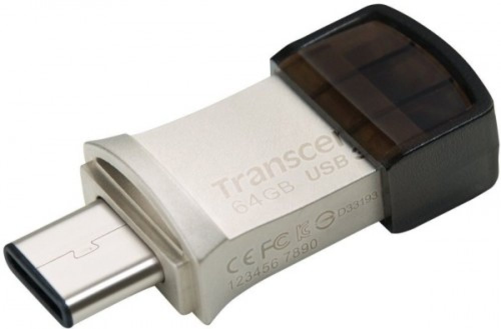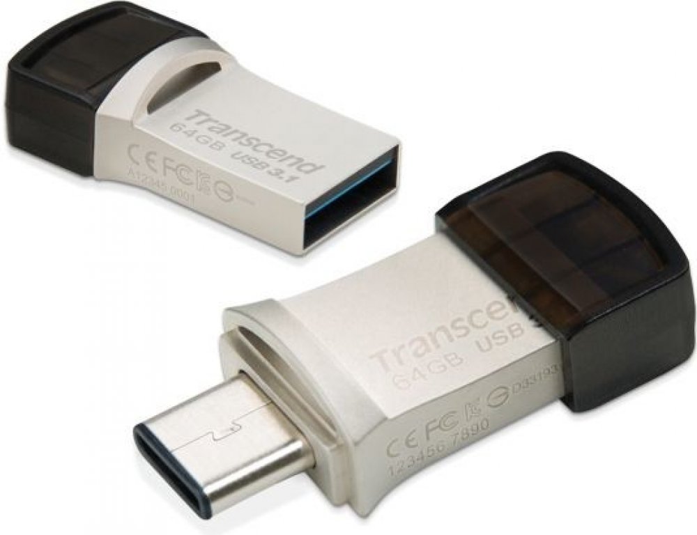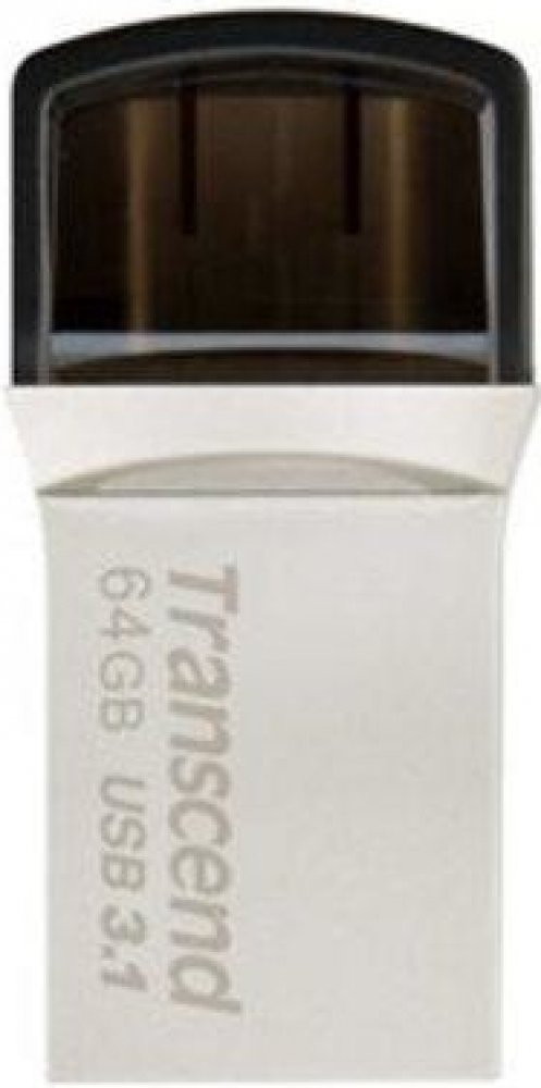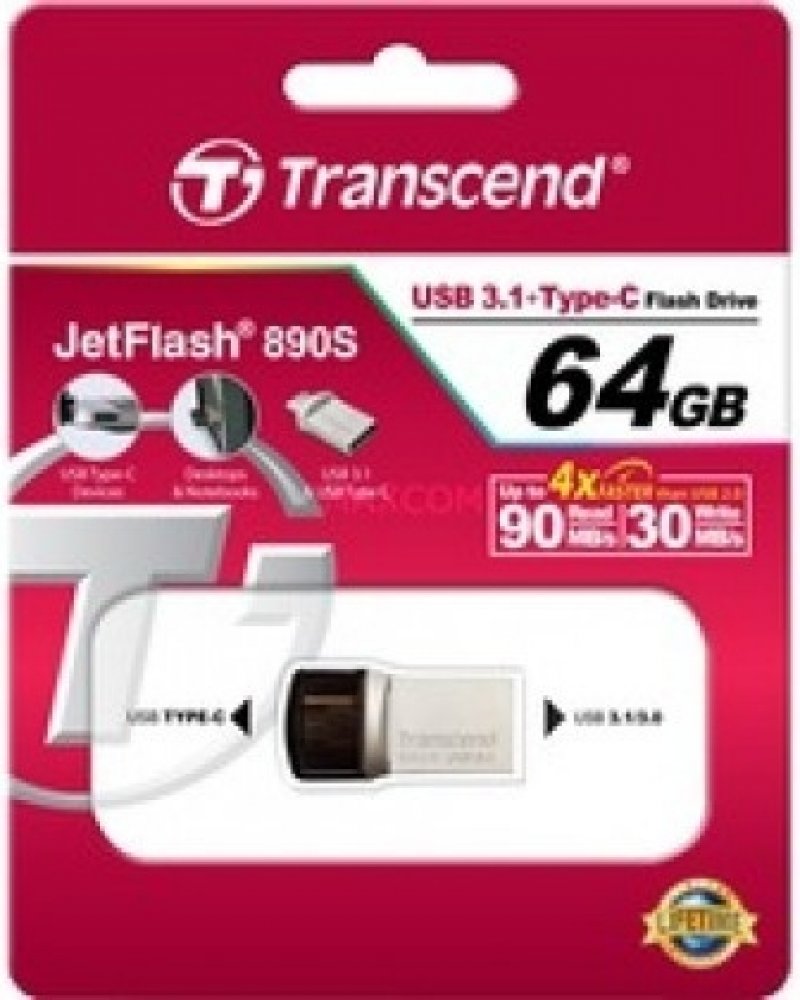 Transcend 64GB JetFlash 890, USB-C/USB 3.1 duální flash disk, malé rozměry, stříbrný kov, odolá prachu i vodě