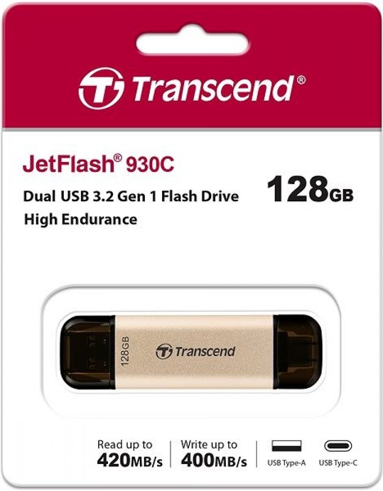 Transcend's JetFlash 930C flash drive features a dual connector that supports USB Type-A and Type-C devices. With a USB 3.2 Gen 1 interface and built-in 3D NAND flash memory, its speeds can reach 420MB/s. High capacity of up to 512GB cre...