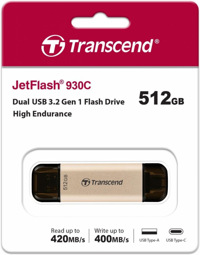 Transcend's JetFlash 930C flash drive features a dual connector that supports USB Type-A and Type-C devices. With a USB 3.2 Gen 1 interface and built-in 3D NAND flash memory, its speeds can reach 420MB/s. High capacity of up to 512GB cre...