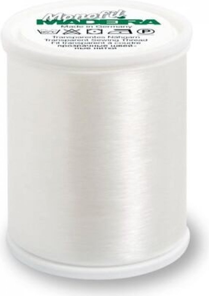 Transparentní šicí nit Monofil č. 40 (1 000 m) čirá - Madeira je transparentní tenká nylonová nit určená k šití, kde nit nemá být vidět, např. přišití poutek, lanek, ozdobných šňůrek, zkracování délek. Používá se také k přišívání aplikací, flitrů apod. Specifikace: Návin: 1000 m Barva: čirá Materiál: 100% polyamid Údržba: