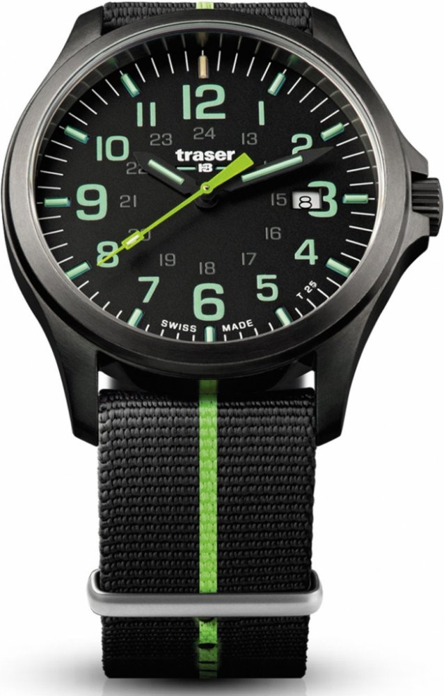 Pánské švýcarské hodinky Traser P67 Officer Pro Gunmetal Black & Lime NATO a hodí se na sport či vojenské použití. Vytvořené černé tělo metodou Gunmetal (totožná s povrchem zbraní). Má ukazatel času, kulatou čočku ze safírového antireflexního skla odolného proti slunci a poškrábání. Ručičky a indexy jsou osazeny trubicemi s technologií trigalight a zajišťuje čitelnost ve tmě. Číslice mají funkci Superluminova. Vodotěsnost do 100 m (lze použít při plavání či šnorchlování). Mají analogový ciferník, s bateriovým pohonem Quartz Ronda 715, s textilním černým popruhem s limetkově-zeleným pásem. S hmotností 62 g. Se šířkou řemínku 2,2 cm. S výškou 1,05 cm. Průměr 4,2 cm.