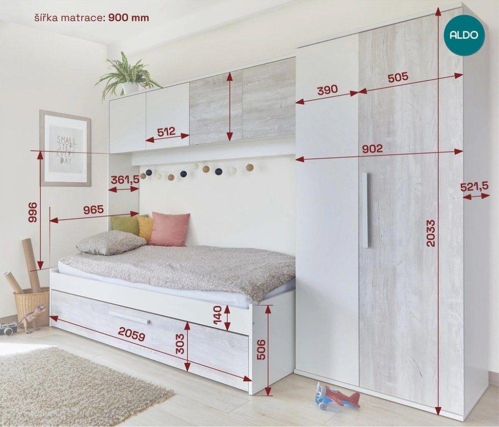 Opravdu jen velmi málo místa k dispozici pro vybavení dětského pokoje?. Představujeme vám unikátní a velmi působivé řešení, jak zařídit rozměrově malý dětský pokoj a to z nabídky španělského výrobce. Design, který je ideální pro panelákový typ pokoje, který je úzký a dlouhý. Navíc v identickém designu můžete pořídit širokou škálu dalšího dětského nábytku a tak máte pro vybavení pokoje vašich dvou dětí nejen nekonečné množství možností, ale daný prostor můžete využít opravdu na maximum. Dvě lůžka pod sebou a nad lůžky skříňky, které jsou po straně doplněné ještě šatní skříní. Nábytek v jedné linii, který příliš nezasahuje do prostoru pokoje.Pokud vám zbude místo, doporučujeme pořídit police s možností zavěšení na stěnu, které dále využijí mnohdy zbytečně prázdné stěny. V identickém designu na výběr i několik typů psacích stolů, komoda, kontejner, šatní skříně, zkrátka vše, co děti potřebují. Ale kromě designu jsme rádi, že vám exkluzivně můžeme nabídnout i vysokou kvalitu prostřednictvím této sestavy. Materiál v dostateční tloušťce, povrchová úprava poctivou dýhou, která zamezuje mechanickému poškození nábytku a to je jistě v dětském pokoji přínosné.Dětský pokoj pro dvě děti, trend moderního bydlenívýška 203,3 cm, šíře 298,4 cm, hloubka 96,5 cmrozměr místa na spaní 90x200 cm pro obě lůžkacelková nosnost lůžek 180 kg, skříň lze umístit na levou i pravou stranusestava v ceně s rošty v podobě větraných desekcelková hmotnost 167 kg, doručíme v 7 balícíchmateriál laminát 16 - 25 mmpovrchová úprava poctivá dýharozměr pro matraci obou lůžek 90x200 cmdolní lůžka pro druhé dítě, nebo k občasnému využitívelikost úložných prostorů rozhodně překvapíširoká nabídka dalšího nábytku v identickém designudětský nábytek s certifikací, španělský výrobceExkluzivní prodej pro Českou republikuŠpanělský dětský nábytek si získal celou řadu zákazníků svým novým, ojedinělým přístupem k vybavení dětského pokoje. Patrové postele ve velmi moderním designu a s možným výběrem z mnoha pastelových od