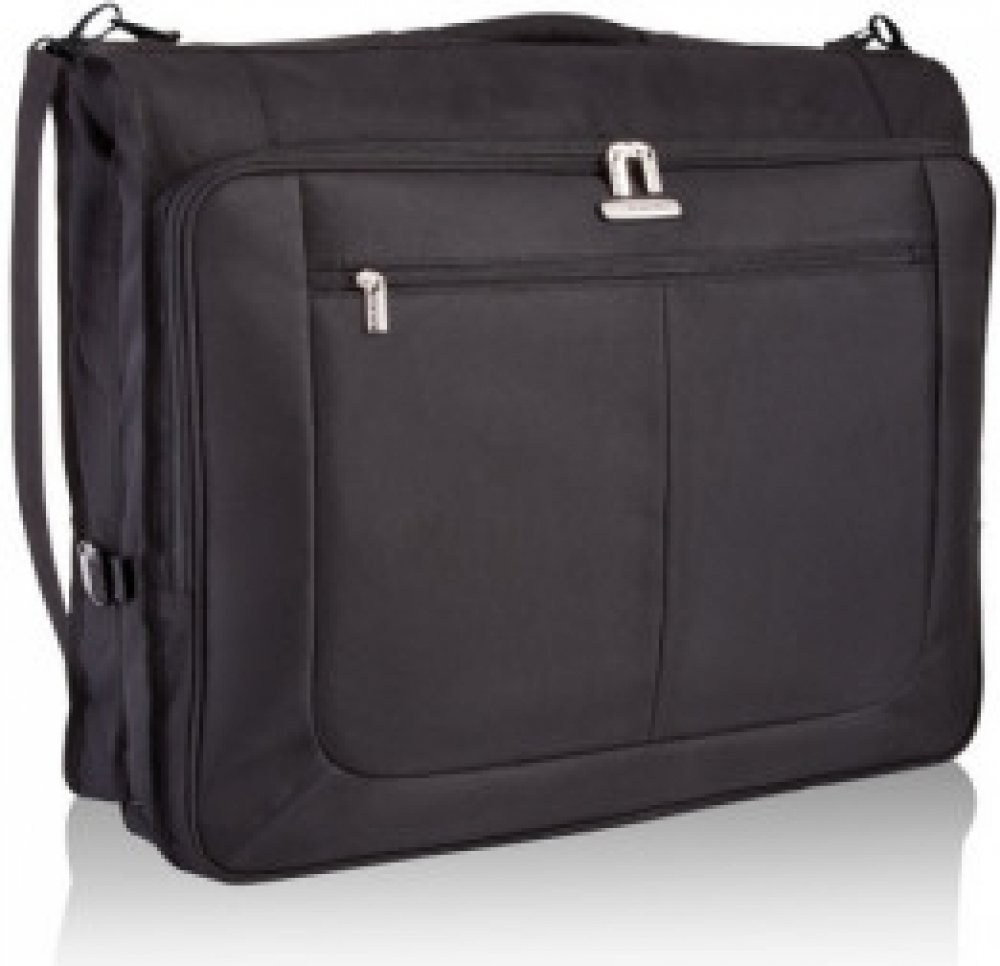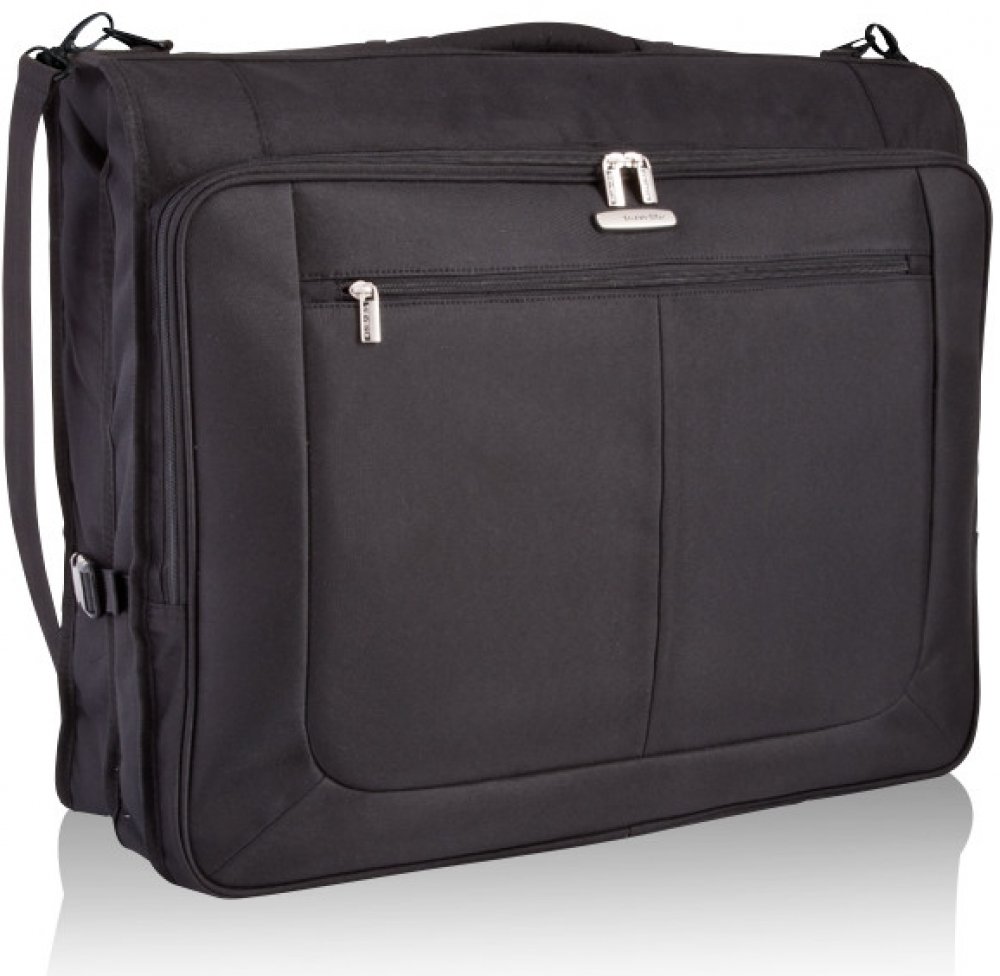 Textilní kufr na oblek s popruhem přes rameno.