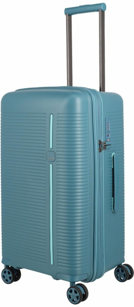 Střední skořepinový kufr na čtyřech kolečkách z nárazuvzdorného polypropylenu v inovativním designu s hlubší zadní částí, vybavený TSA zámkem a expandérem.