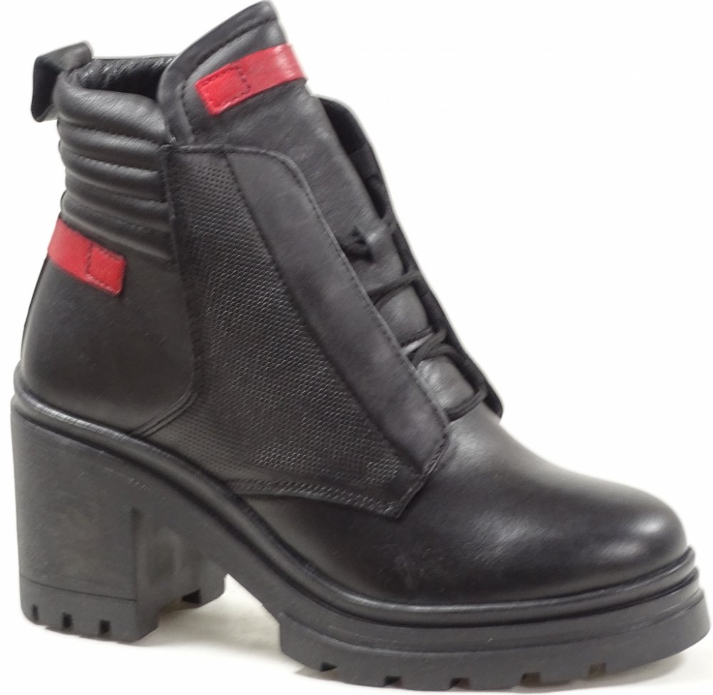 Moderní dámská obuv s vyšším širokým podpatkem a hladkým svrškem v černé barvě má pro ještě snadnější nazutí na vnitřní straně funkční zip a tkaničkami na šněrování si ji můžete upravit přesně podle Vašich představ.