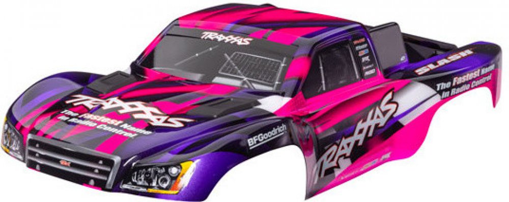 Traxxas karosérie Slash 2WD růžová (bezsponková). Nabarvená, sestavená karoserie, včetně bezsponkového držáku pro upevnění. Pro starší šasi Slash se sponkovým systémem upínaní karoserie je vyžadován díl #6940 (Slash 2WD), nebo díly #6976 a #10125 (Slash 4x4).