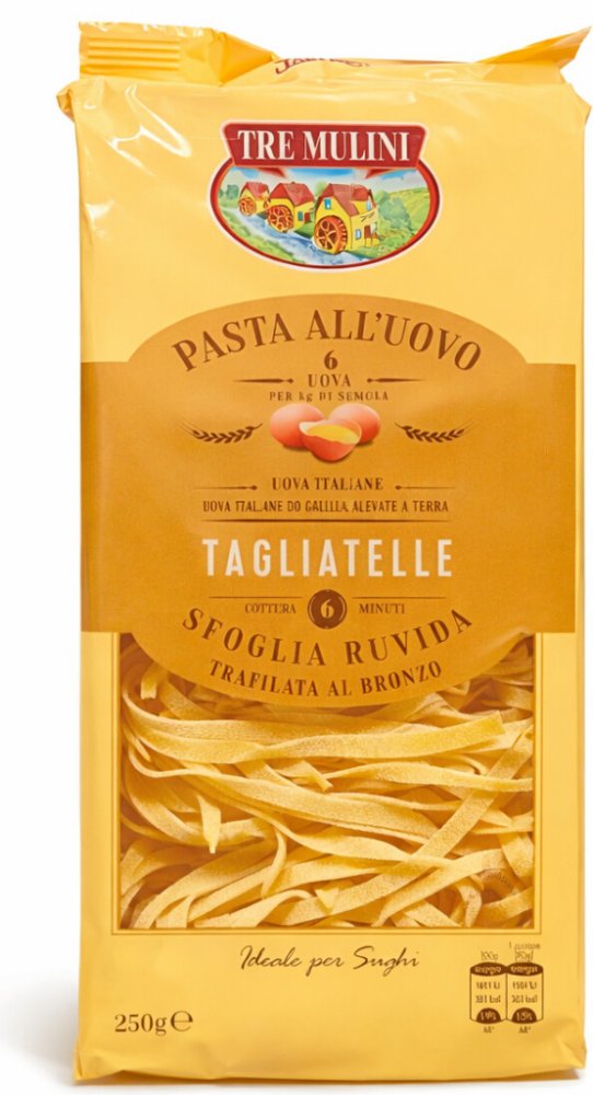 Tre Mulini Tagliatelle jsou kvalitní vaječné těstoviny vyrobené z pšeničné krupice a čerstvých vajec. Proces bronzového tažení (trafilata al bronzo) dodává těstovinám lehce drsný povrch, díky kterému perfektně drží omáčku.