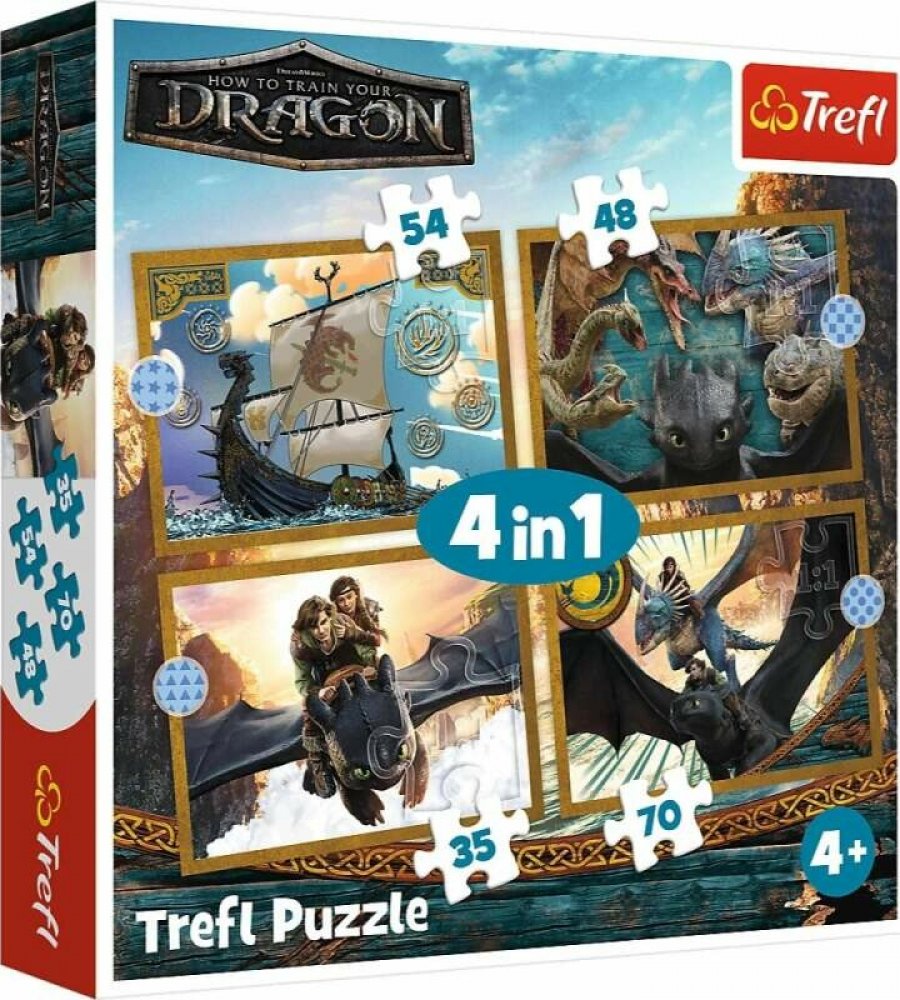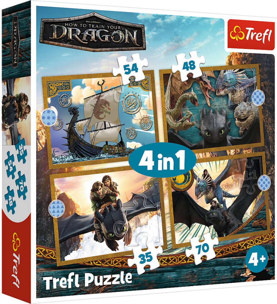 Hra 4v1 – Dračí dny – Trefl 34678 Dračí dny jsou 4 nezávislé skládačky pro děti, navržené s ohledem na malé fanoušky dobrodružství hrdinů filmu Jak vycvičit draka. Po složení puzzle vzniknou 4 obrázky, z nichž největší má rozměry 285x205 mm. Různorodý počet dílků umožňuje hrát si jak mladším, tak i o něco starším dětem.