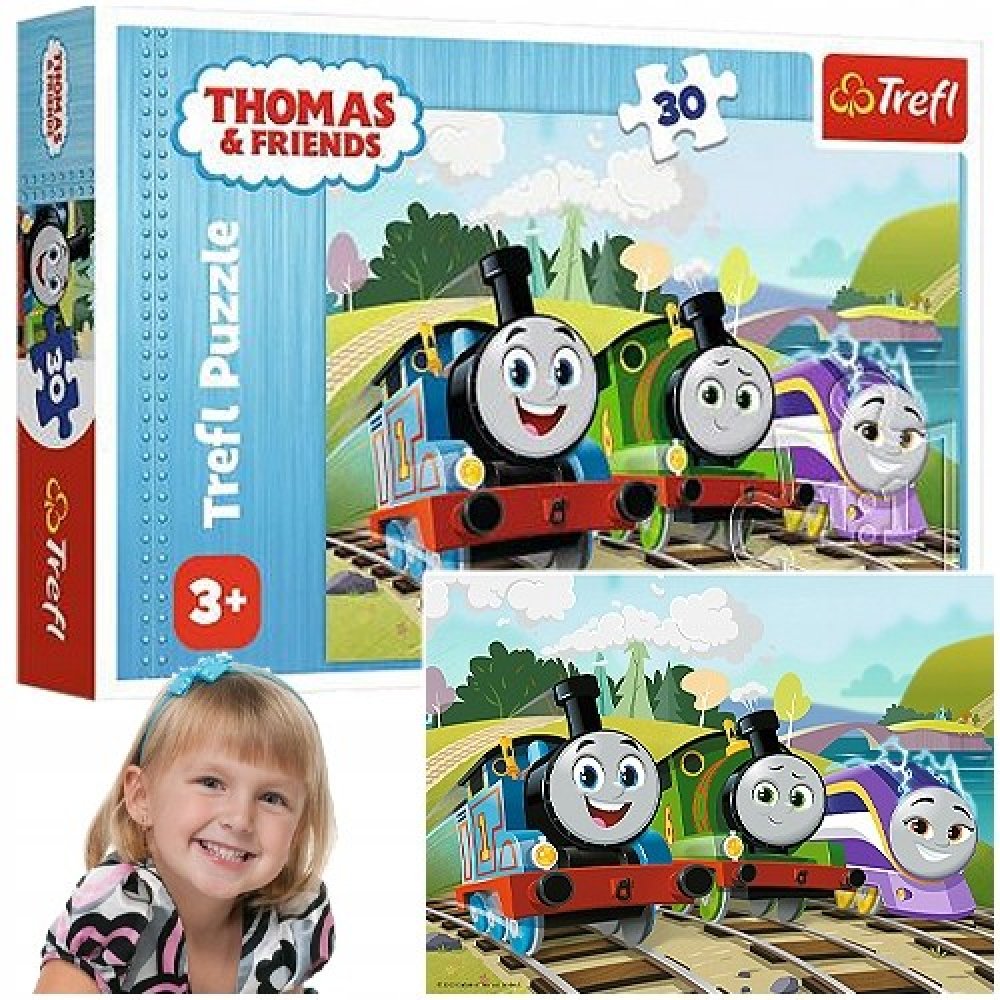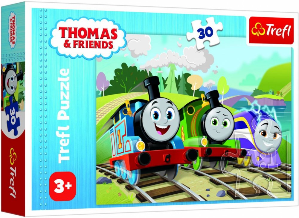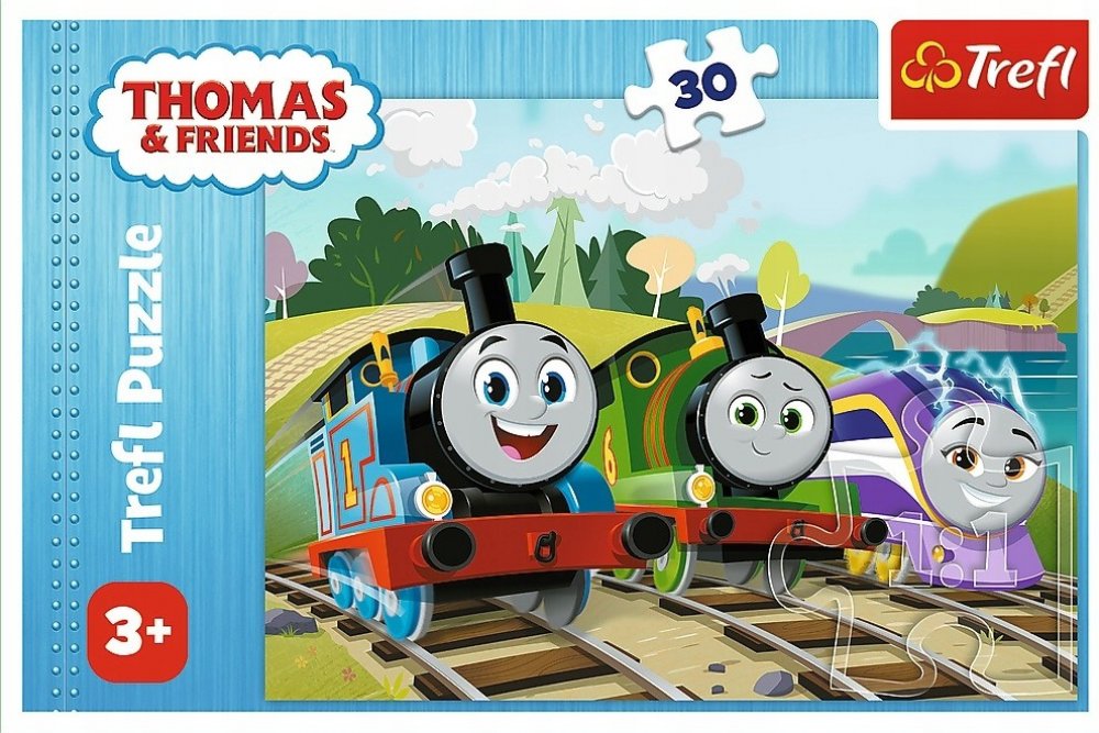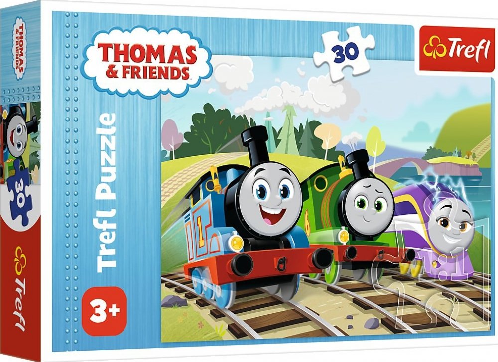 Puzzle - "30" - Veselý Tomášek Trefl 18294Veselý Tomášek jsou puzzle skládající se z 30 dílků, navržené speciálně pro malé fanoušky pohádky Tomáš a jeho přátelé. Po složení puzzle vznikne obrázek o rozměrech 270x200 mm.Puzzle jsou vyrobeny z vysoce kvalitních přírodních materiálů, s použitím speciálního, kalandrovaného papíru odrážejícího světlo, díky kterému je skládání ještě příjemnější a snazší...